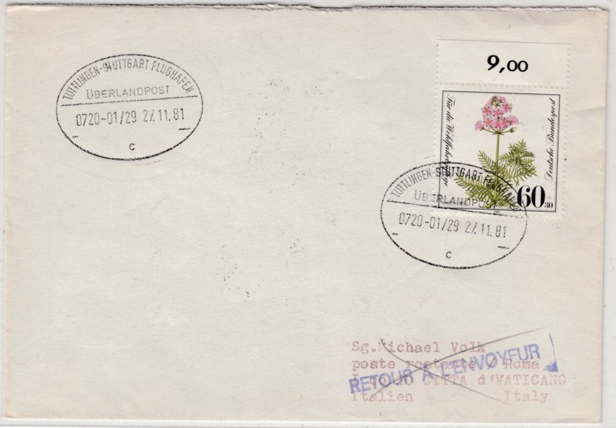 BRD - Überlandpost Tuttlingen - Stuttgart/Flughafen 0720-01/29, Brief n. ITALIEN