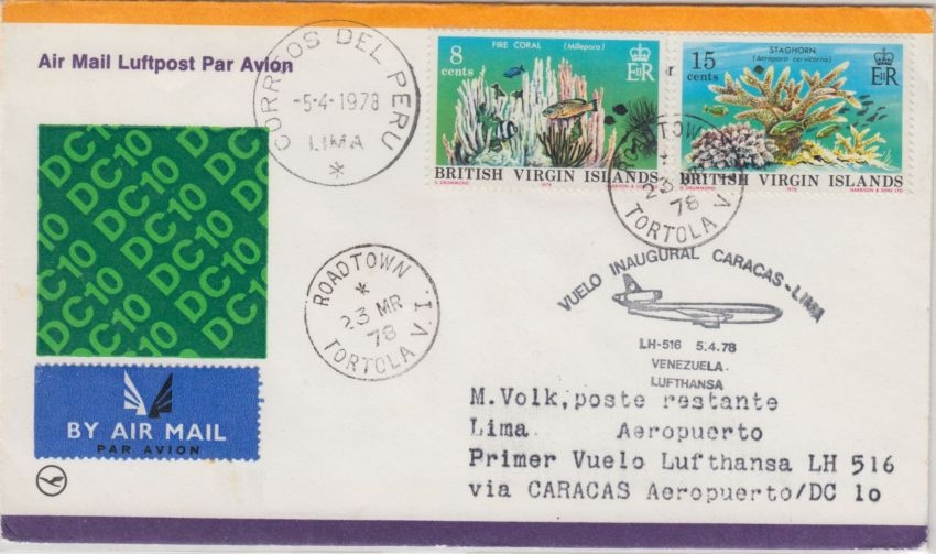 British Virgin Island - 8+15 C. Korallen LH 1st-Flug Caracas Lima 1978 Zuleitung