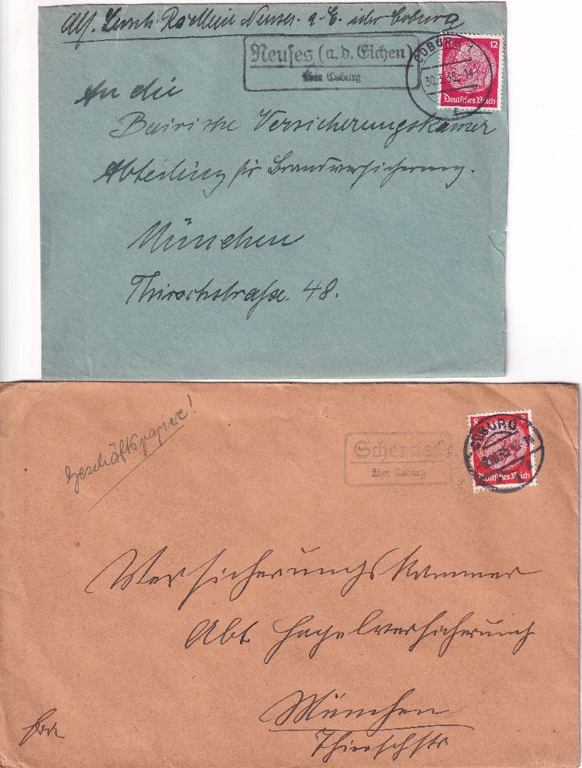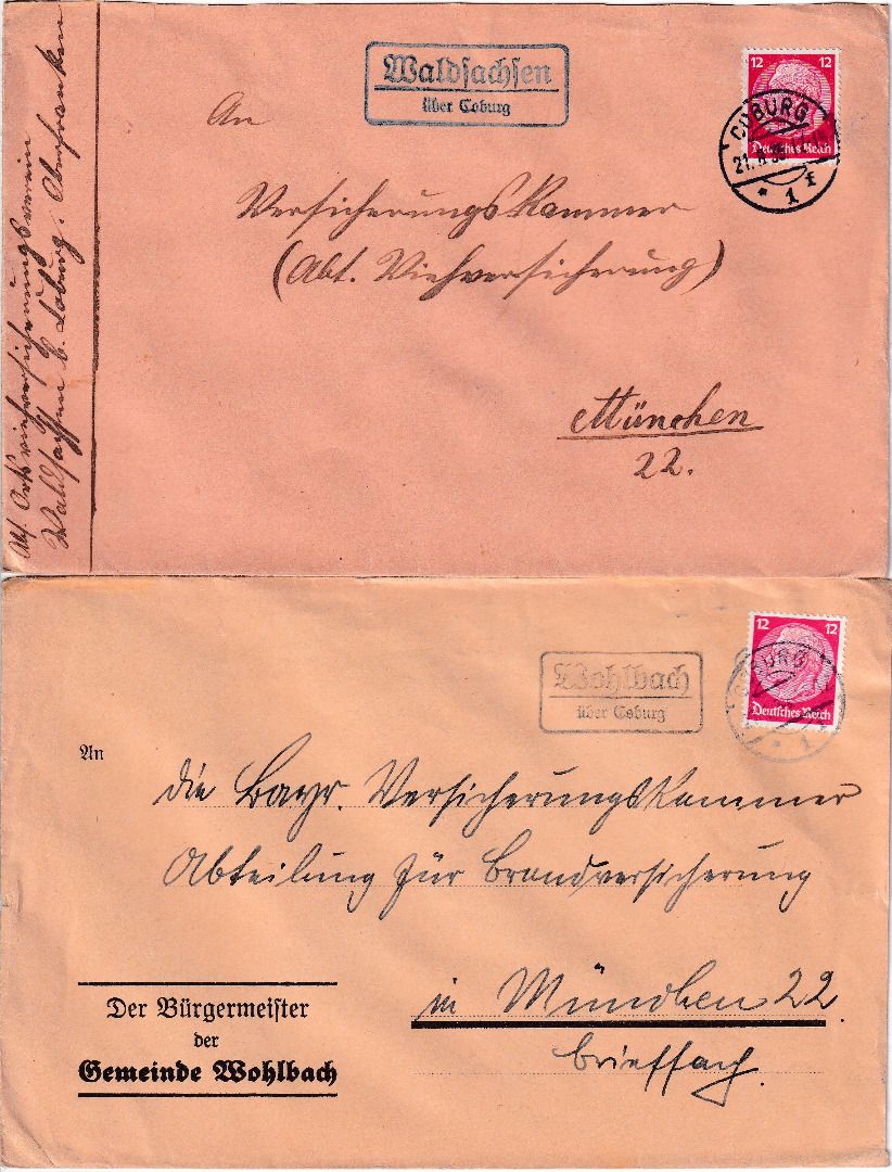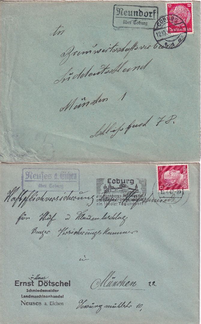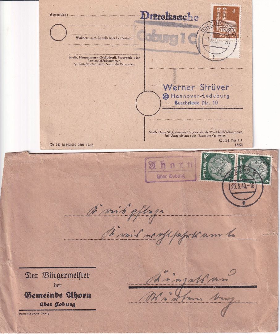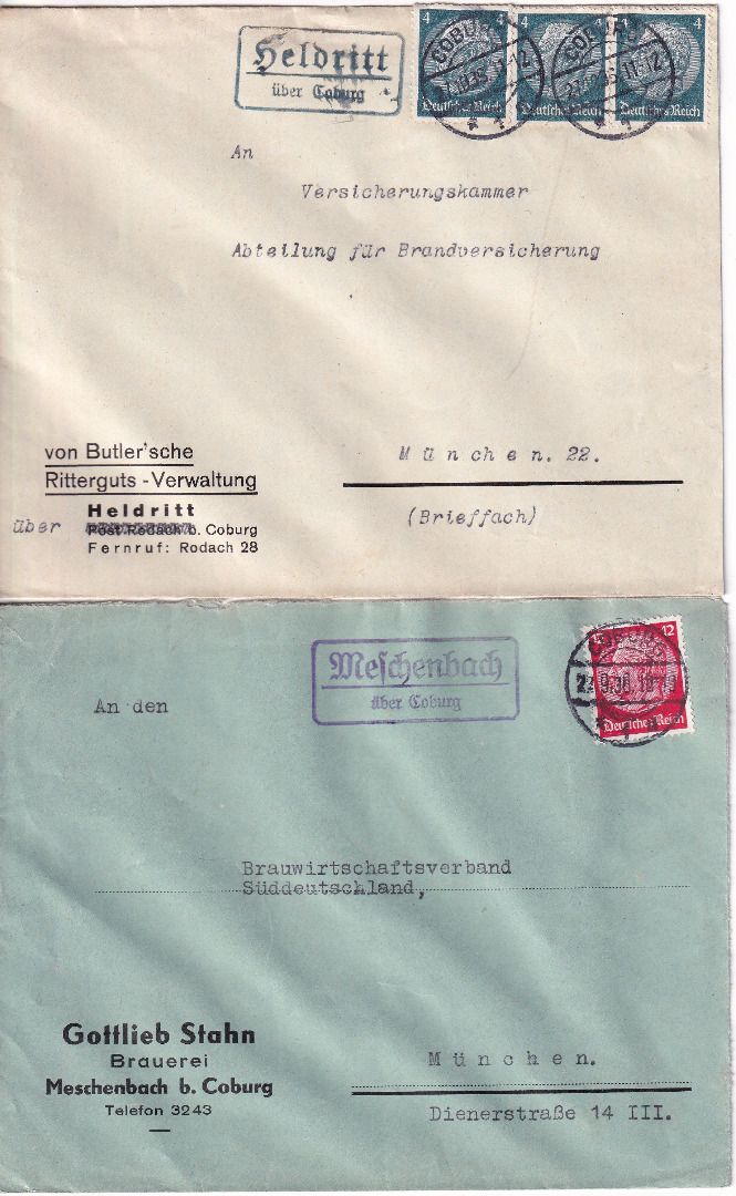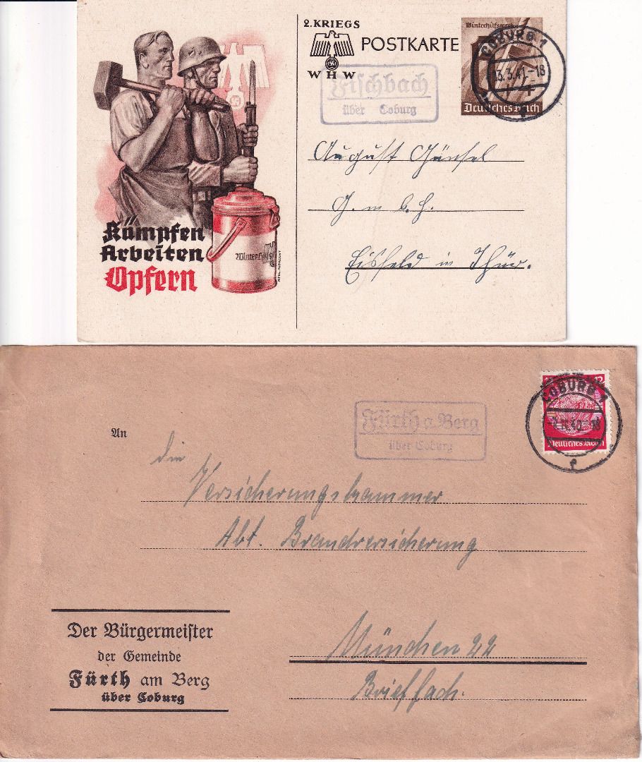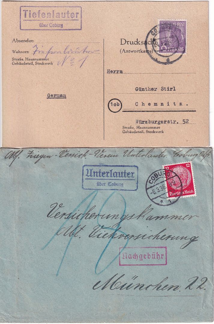Sammlung von 18 verschiedenen Landpoststellen-Stempeln (evtl. inkl.Untertypen) auf Briefen und Postkarten aus dem Zeitraum 1935 bis 1950: Coburg 1C (Stadtpoststelle !), Ahorn, Fischbach, Fürth, Gauerstadt, Gestungshausen, Großgarnstadt, Hassenberg, Heldritt, Meschenbach, Neundorf, Neuses a. Eichen, Neuses (a.d.Eichen), Scherneck, Tiefenlauter, Unterlauter, Waldsachsen, Wohlbach - in der Reichhaltigkeit mit teils seltenen Stempeln wohl kaum mehr zusammenzutragen - Umschläge teilweise mit Bedarfsspuren - möglicherweise werde nicht alle Bilder angezeigt/bitte ggf. Kontakt aufnehmen - BITTE keine Anfragen wegen Einzelentnahmen