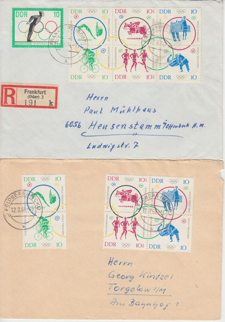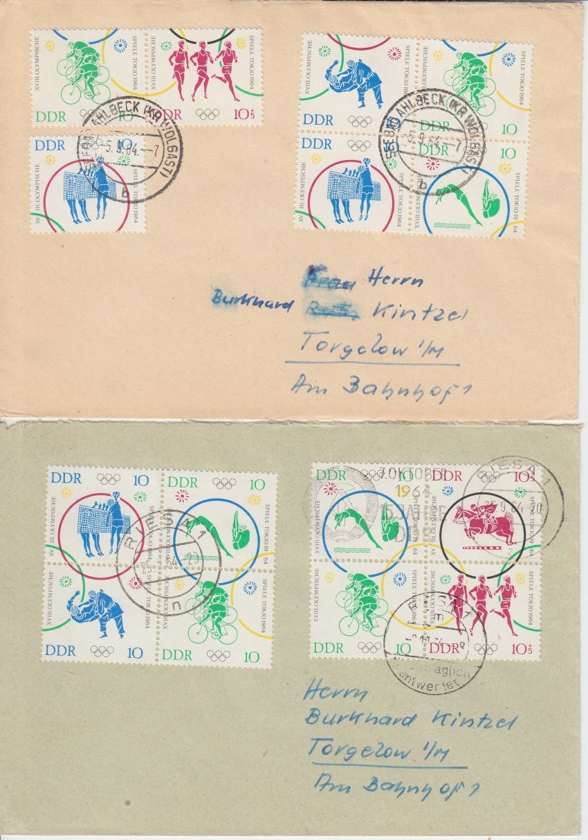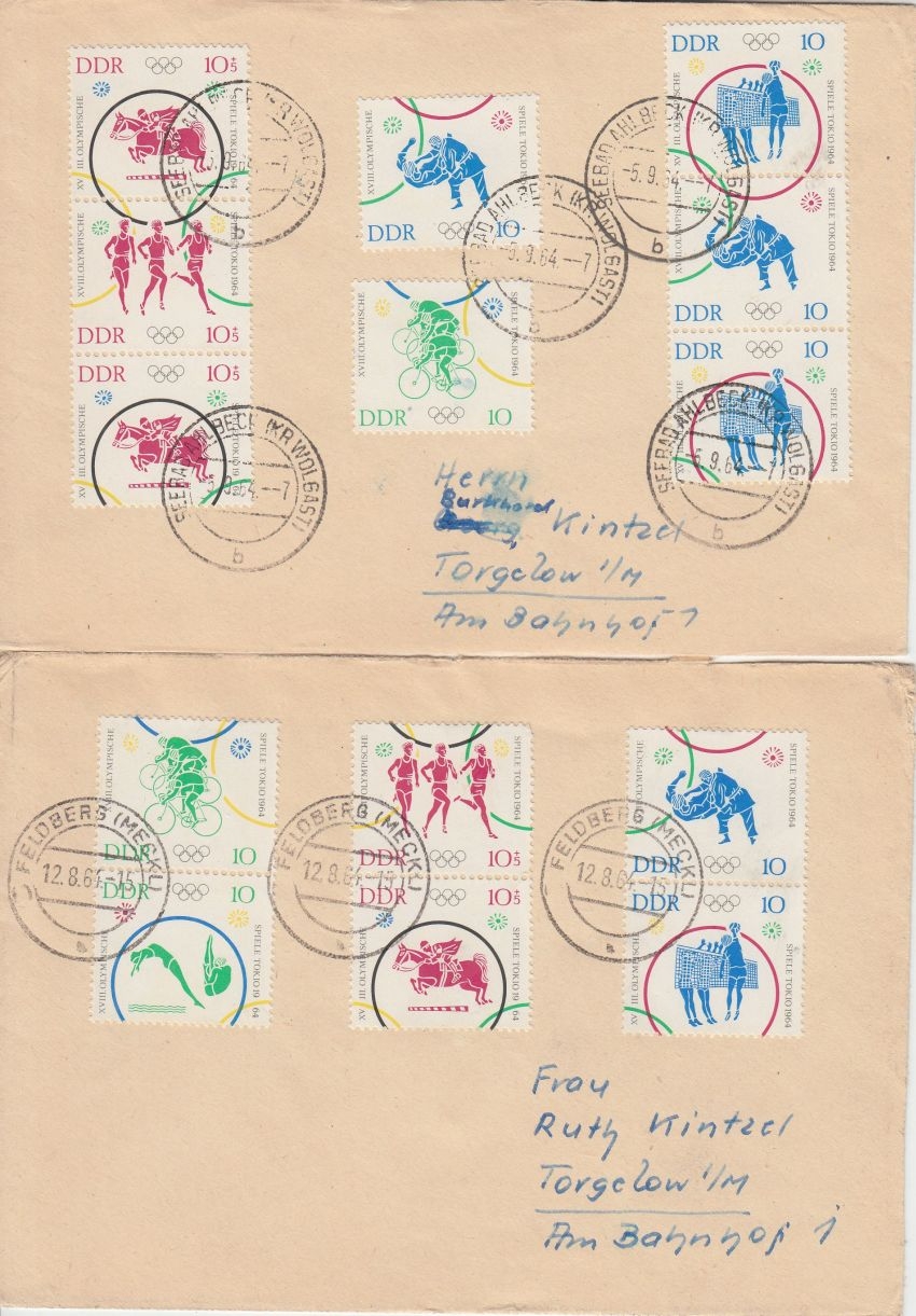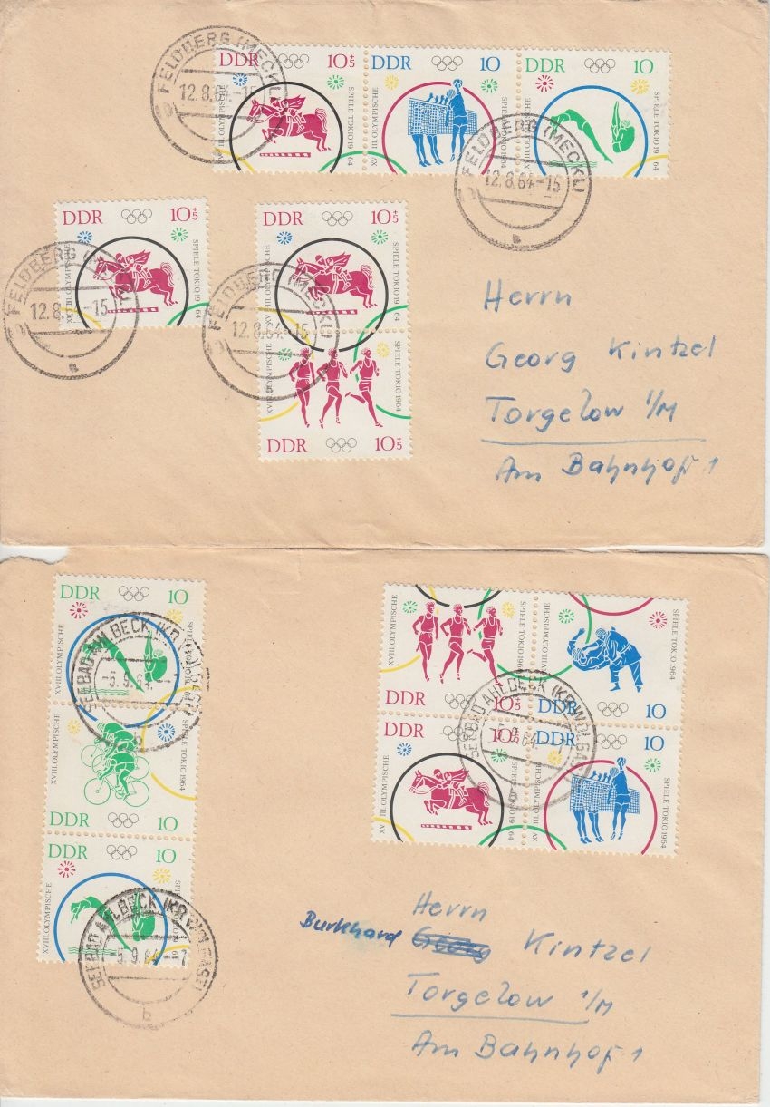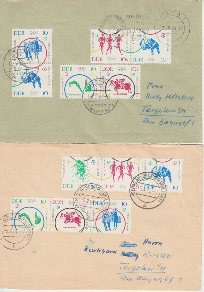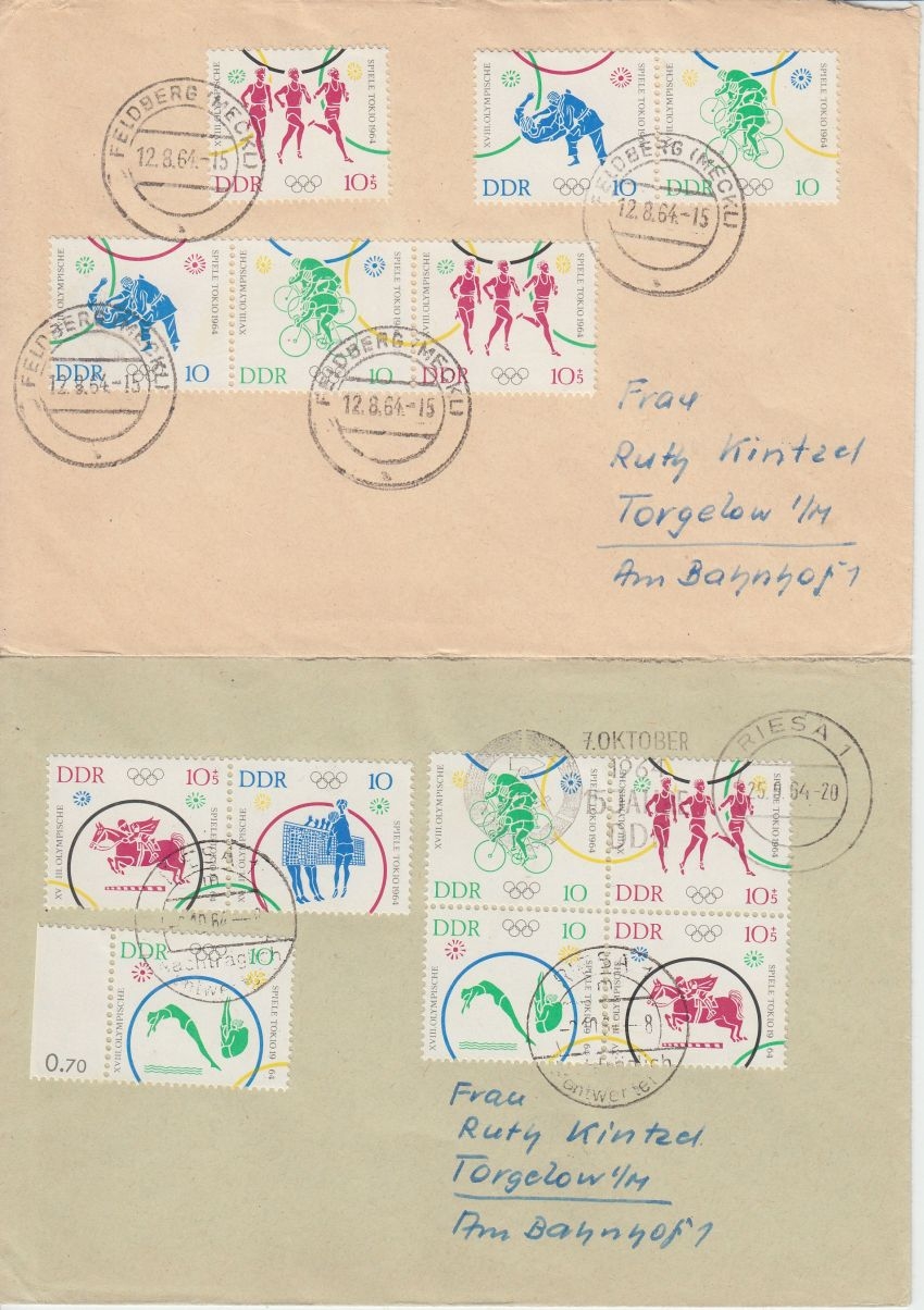 waagrechte und senkrechte Zusammendruckkombinationen, alle mit Tagesstempel-Entwertung: Frankfurt a/O., Seebad Ahlbeck, Feldberg, Riesa, - hoher Katalogwert