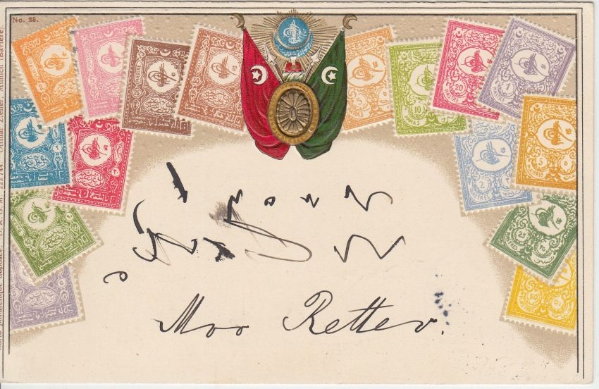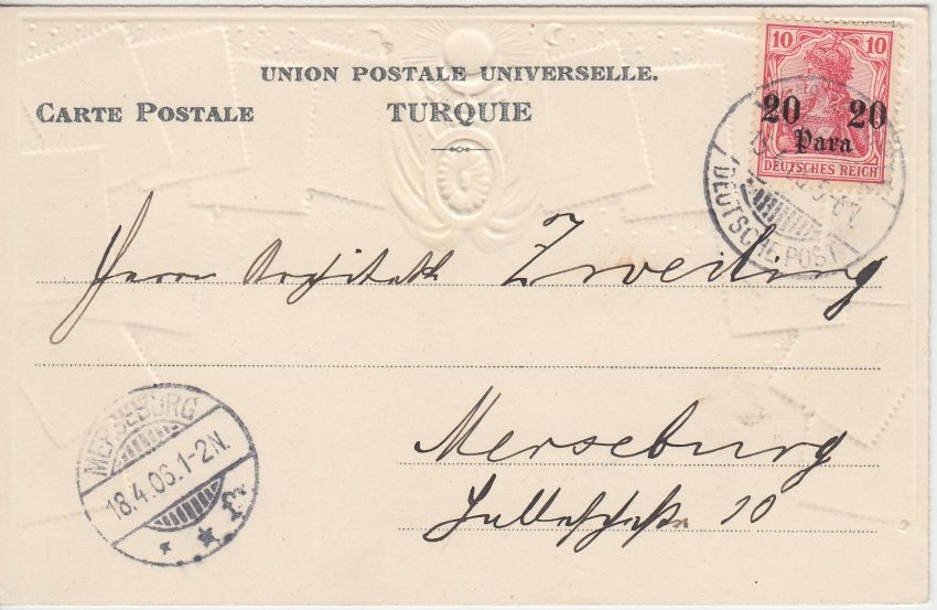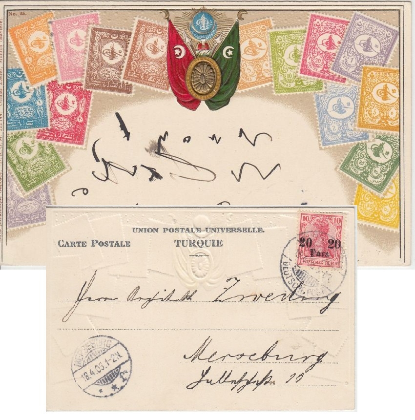 DP Türkei - 20 P. a. 10 Pfg. Germania Briefmarken-Prägekarte Constantinopel 1906