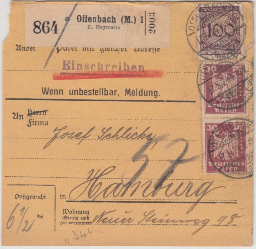 Hamburg 1924 - beide 30 Pfg. Adler ebenfalls m. Firmenlochung "DH" (D. Heymann)