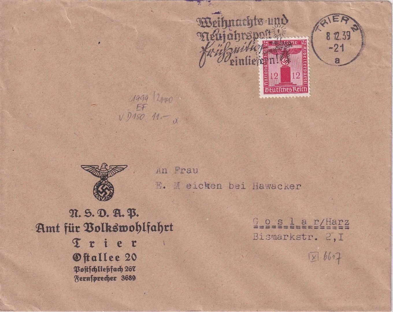 DR - 12 Pfg. Adler/Sockel Dienstbrief NSDAP Trier - Goslar 1939
