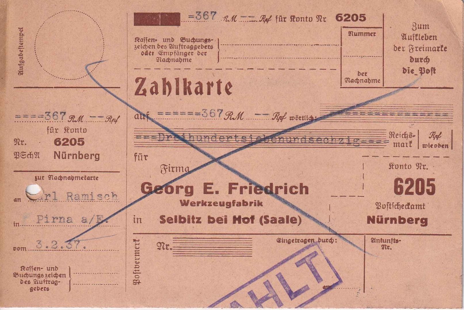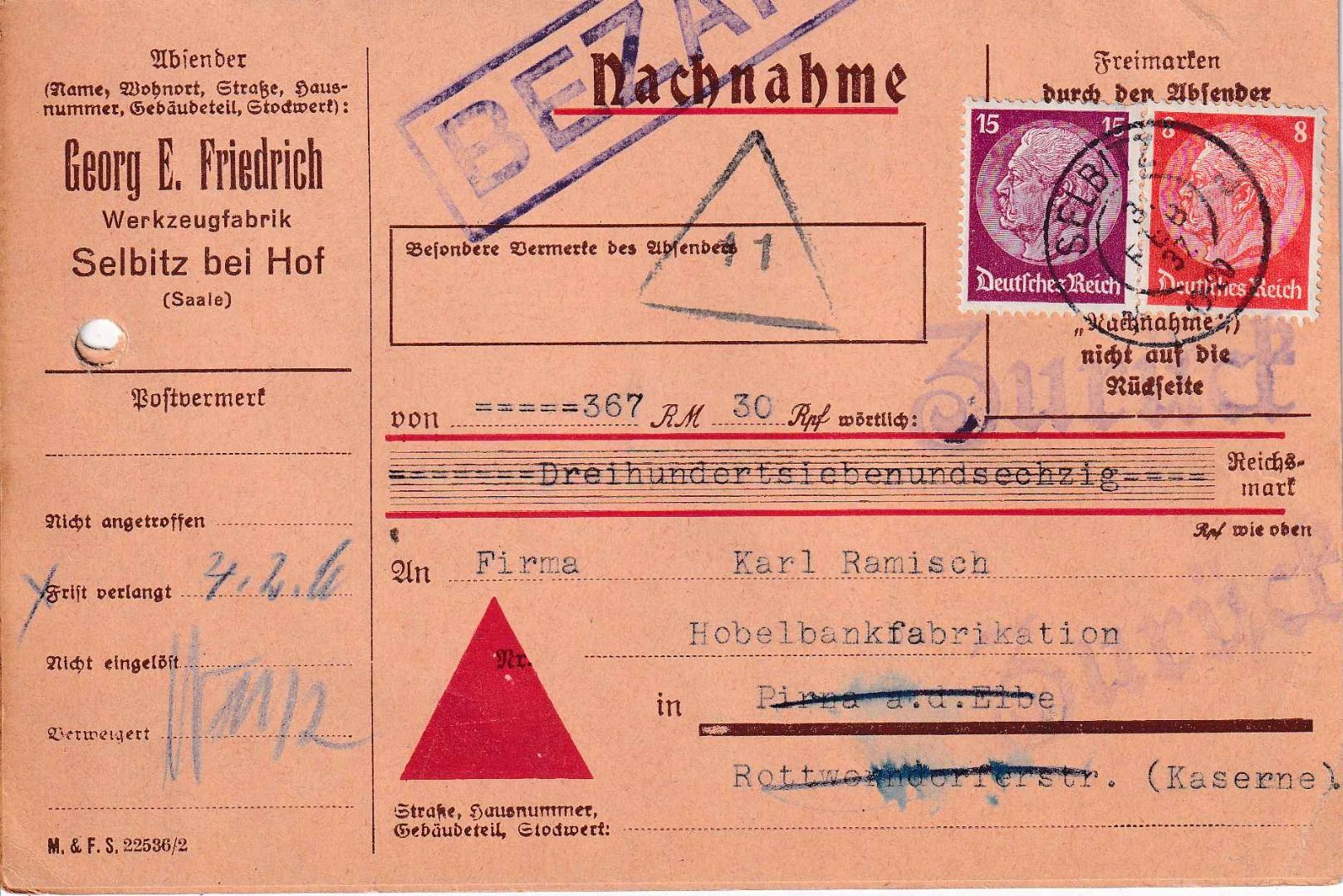 DR - 15+8 Pfg. Hindenburg Nachnahme-Drucksachenkarte Selbitz - Pirna 1937