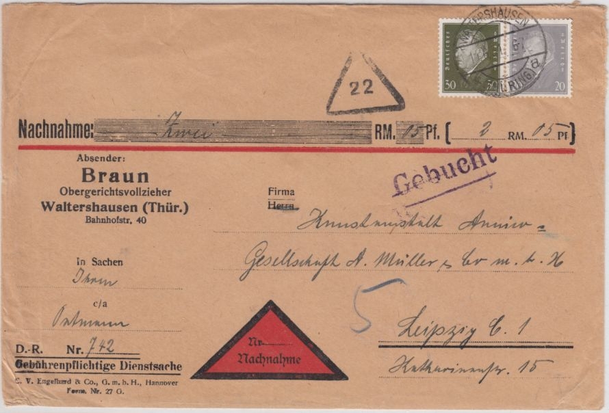 DR - 20+30 Pfg. Ebert, Nachnahmebrief Waltershausen - Leipzig 1931
