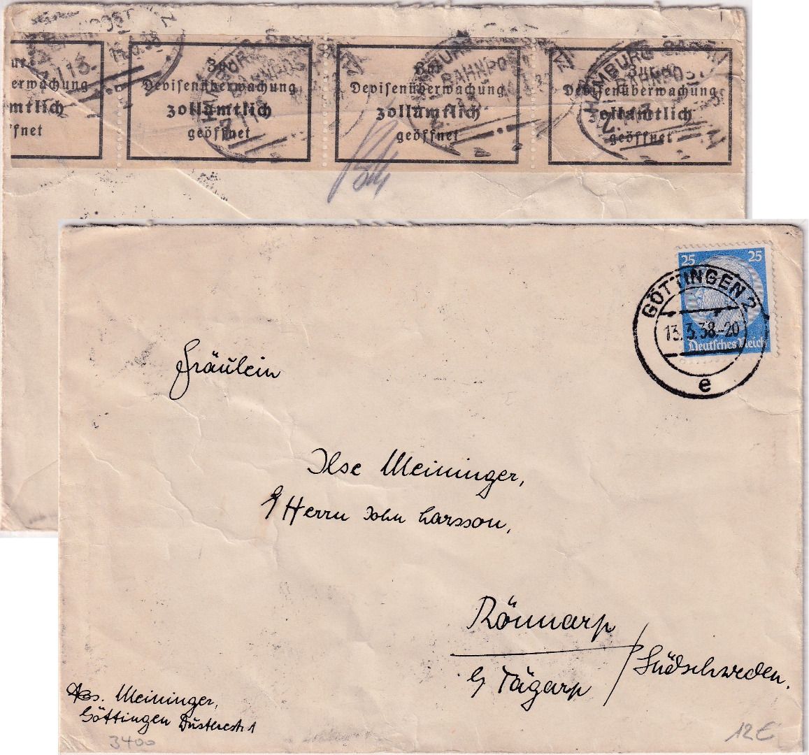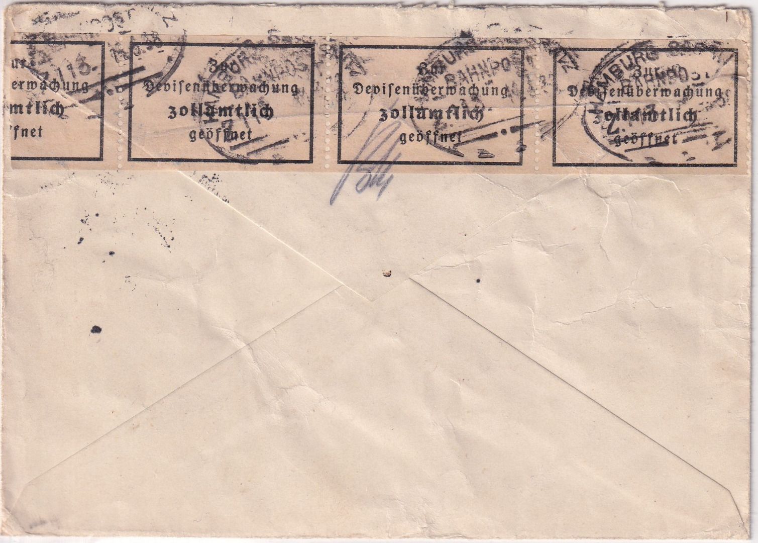 rs. Verschlussstreifen d. Devisenzensur, gestempelt Bahnpost Hamburg Sassnitz - ohne Inhalt