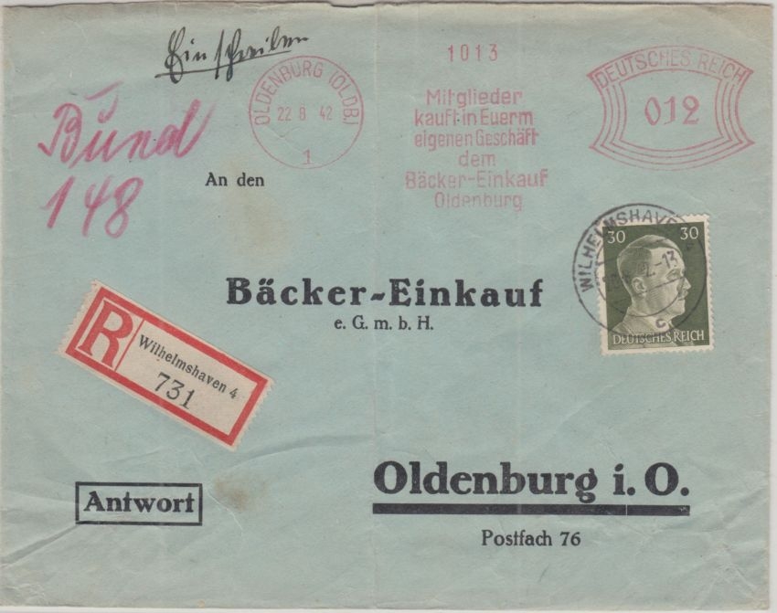 vorfrankiertes Antwortkuvert (daher senkr. Bug) mit 30 Pfg. auffrankiert - interessante Kombination - ohne Inhalt - Stichwort: Backen, Bäckerei, Bäcker