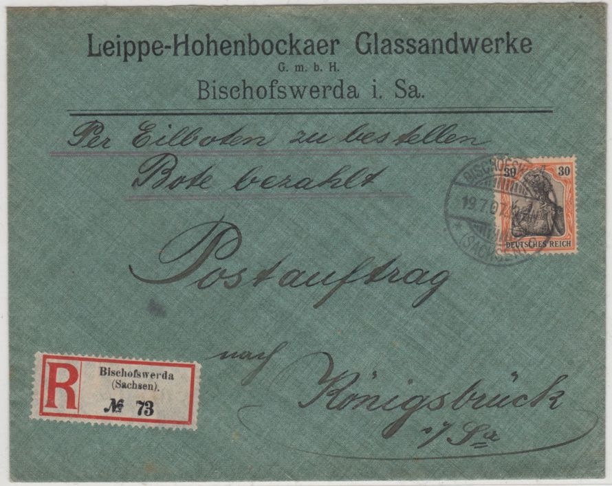Königsbrück - nur die üblichen 30 Pfg. für den Postauftrag verklebt, Eilboten wurde nicht extra berechnet und wahrscheinlich auch nicht befördert - ohne Inhalt