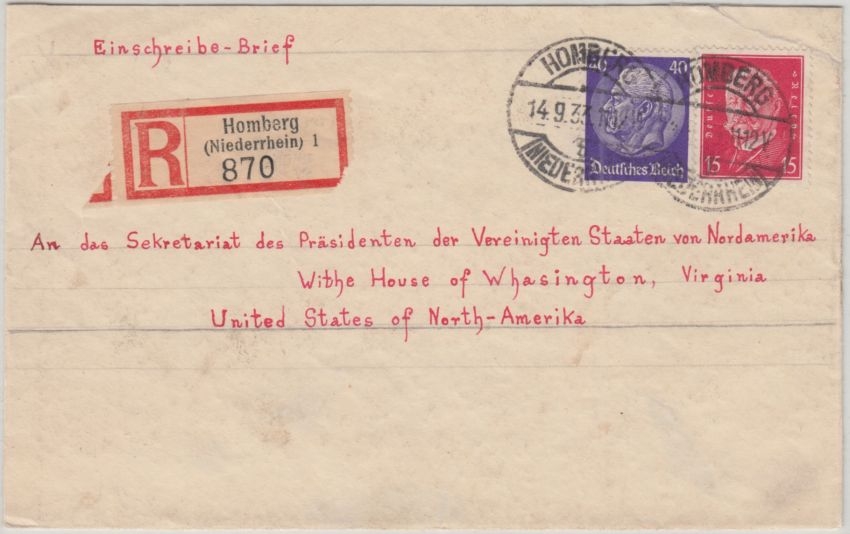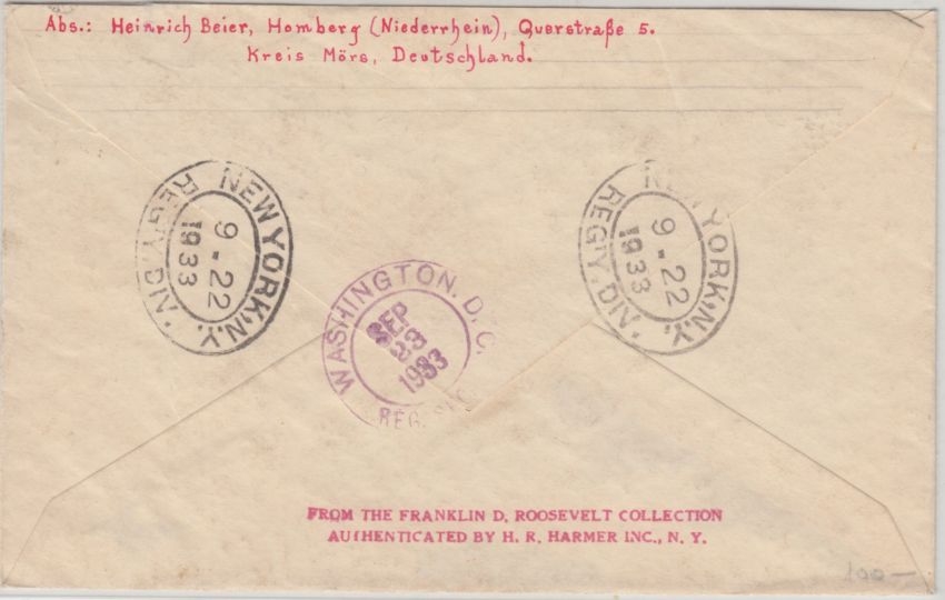 adr. an das Weiße Haus - rs. roter L2 "From the Franklin D. Roosevelt Collection - Authenticated by H.R.harmer Inc. NY"