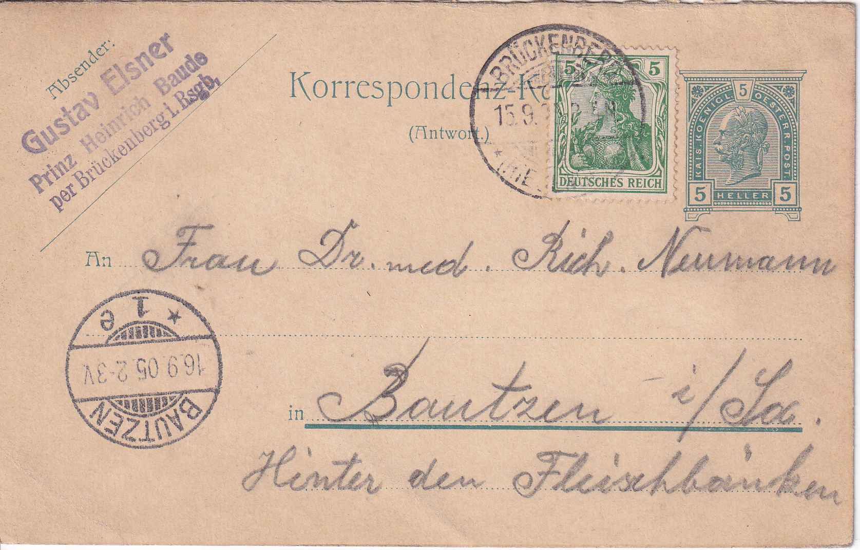 DR - 5 Pfg. Germania Karte (österr. Antwortganzsache) Brückenberg - Bautzen 1905