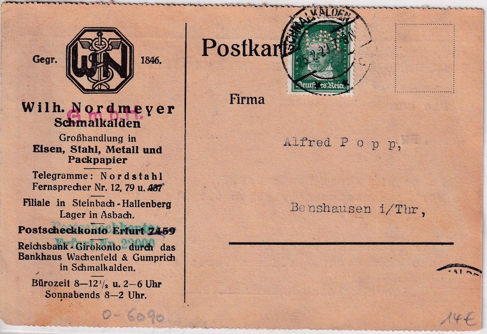 DR - 8 Pfg. Beethoven Perfin "WN" Firmenkarte Zella-Mehlis - Benshausen 1929