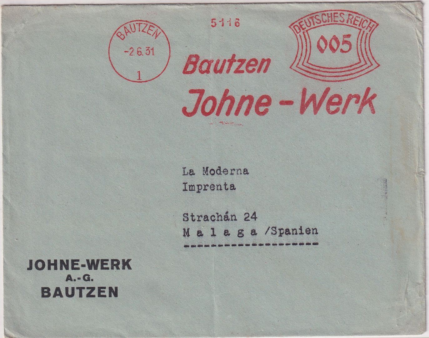 DR - Bautzen 1931 5 Pfg. AFS "Johne-Werk" Drucksache n. SPANIEN
