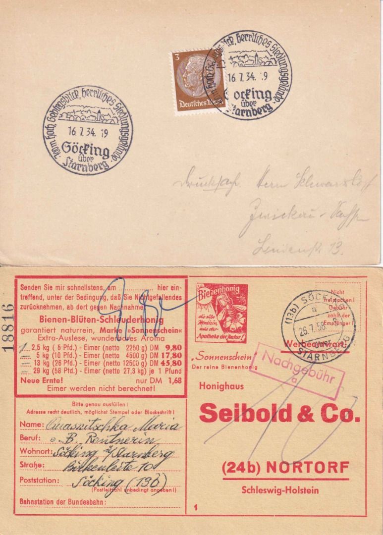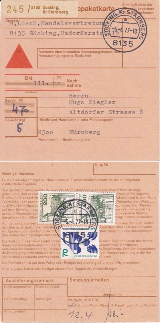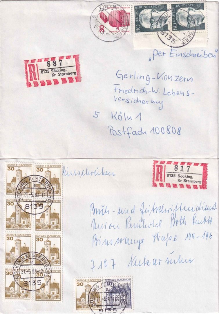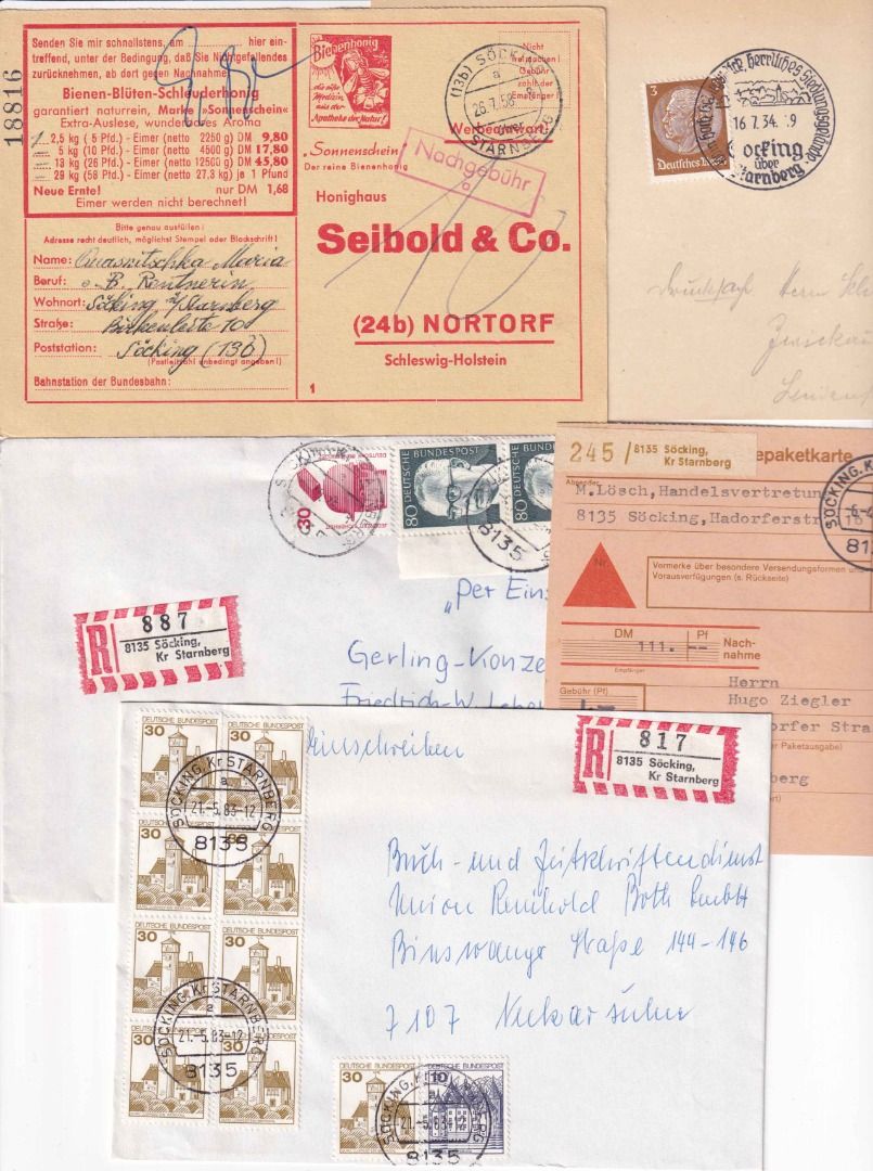 darunter Poststelle I (2x), 2 Einschreibebriefe, Nachnahmepaketkarte