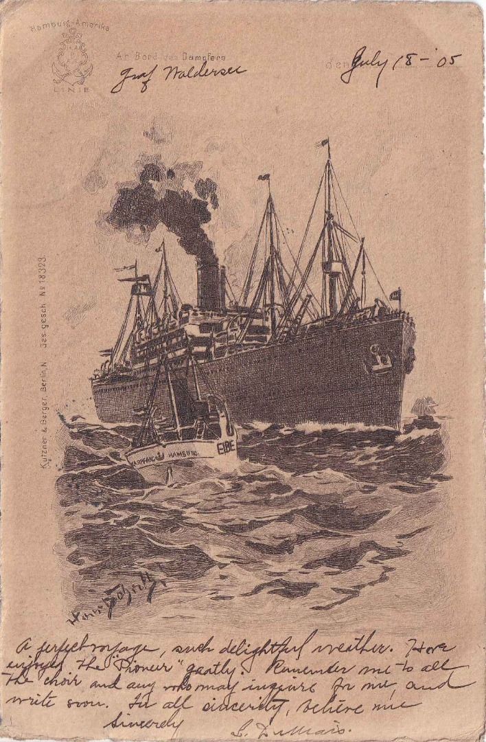 gelaufen "an Bord Graf Waldersee" n. New York - Schiffs-AK der Hamburg-Amerika-Linie - kleine Altersspuren