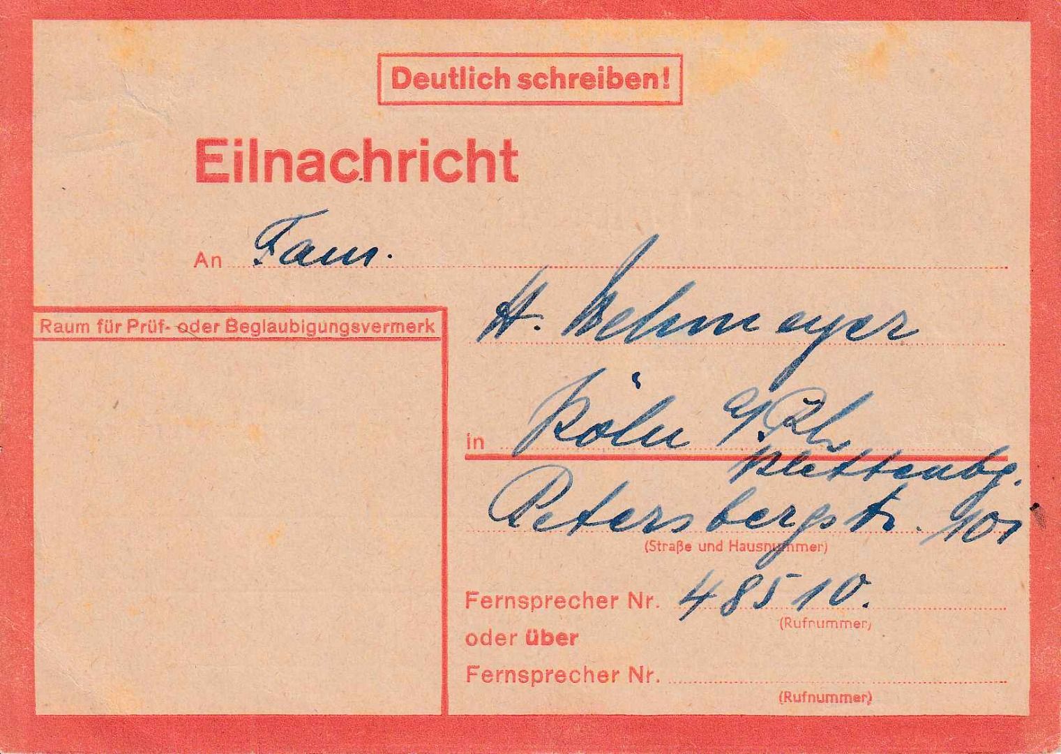 DR - Eilnachrichtenkarte Berlin-Zehlendorf n. Köln 20.5.44