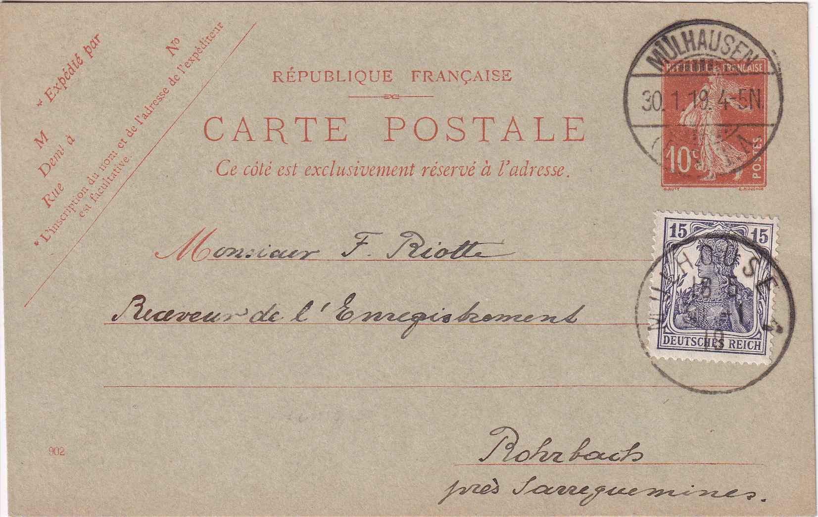 franz. Ganzsache m. dt. Stempel - die 15 Pfg. Germania mit dem franz. Stpl. Mulhouse 16.5.19 - philatelistisch beeinflusst und trotzdem Zeitgeschichte !