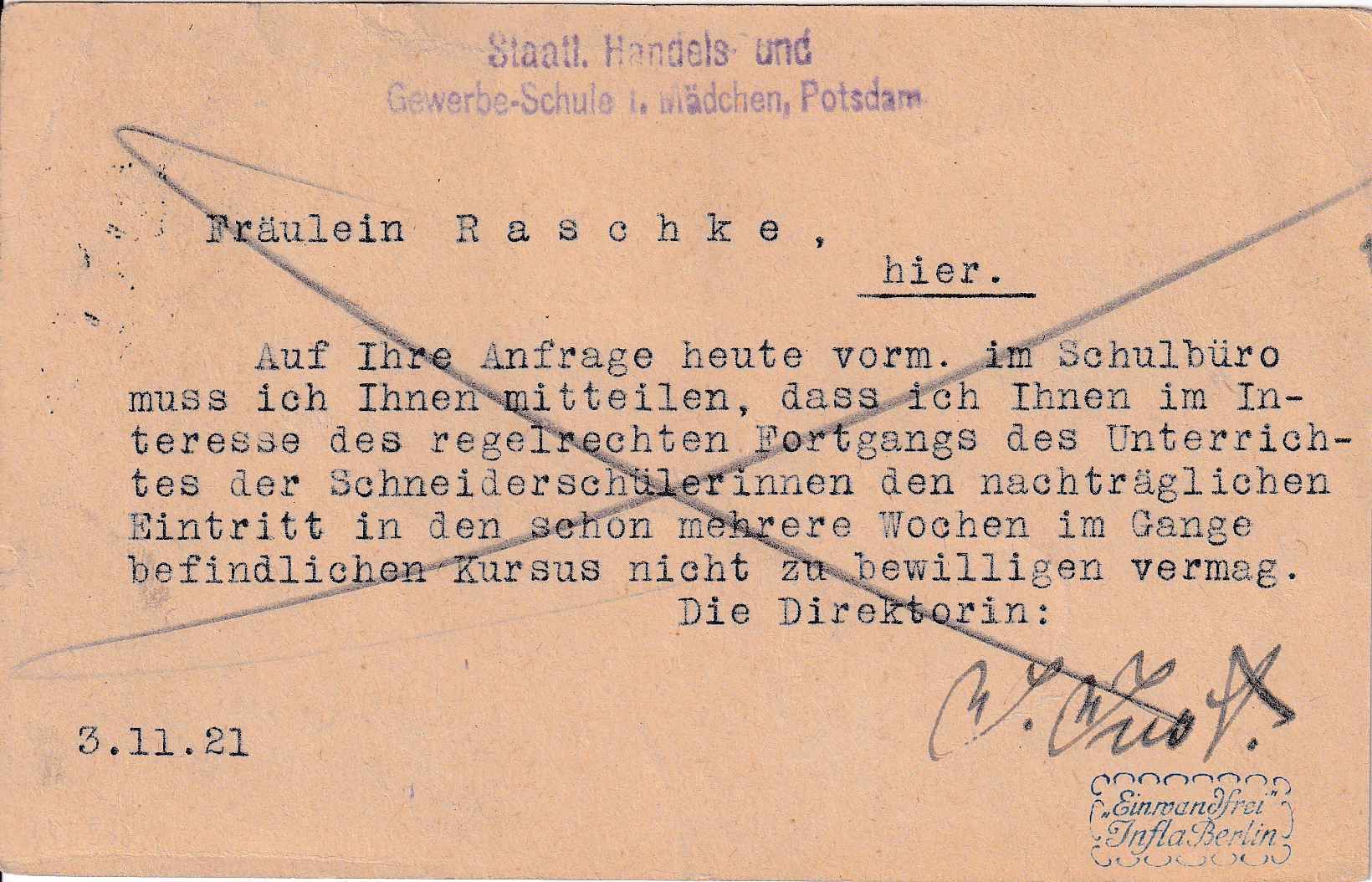DR-Infla - 10 Pfg. Dienstganzsache "21" +Zusatz Ortskarte Potsdam 3.11.21 Retour
