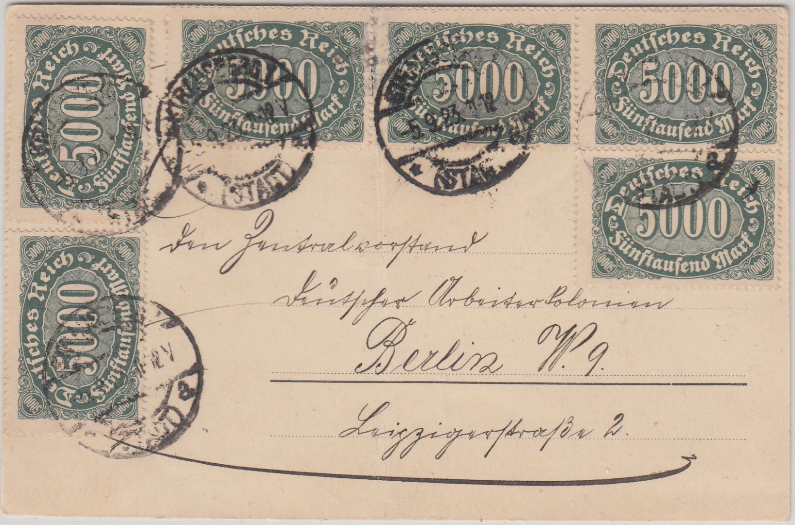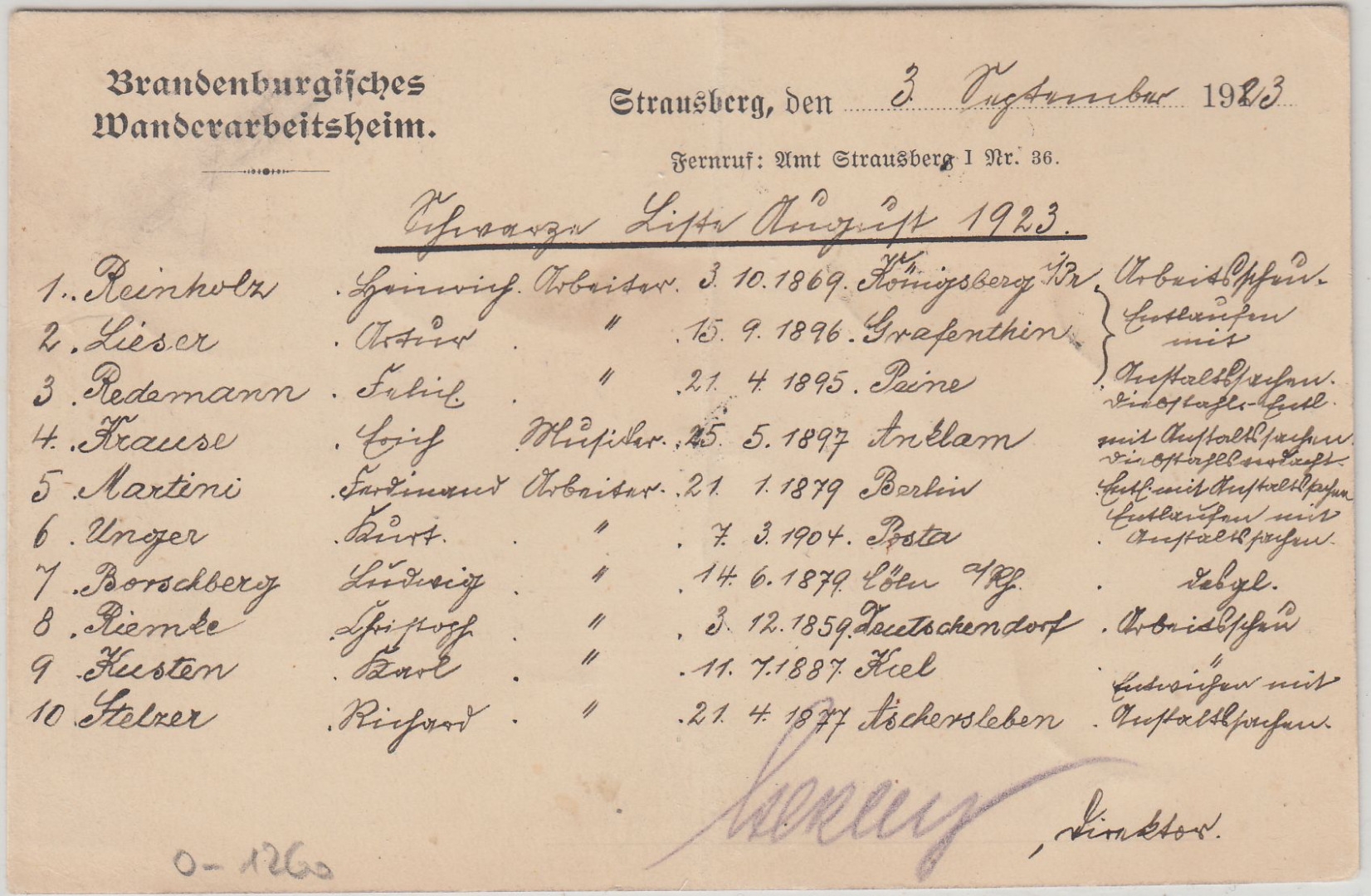 Abs. "Brandenburgisches Wanderarbeitsheim" - "Schwarze Liste Augsut 1923" (Meldung arbeitsscheuer und straffälliger Wohnsitzloser) an den "Zentralvorstand d. Deutschen Arbeiterkolonie" in Berlin - Zeitdokument !