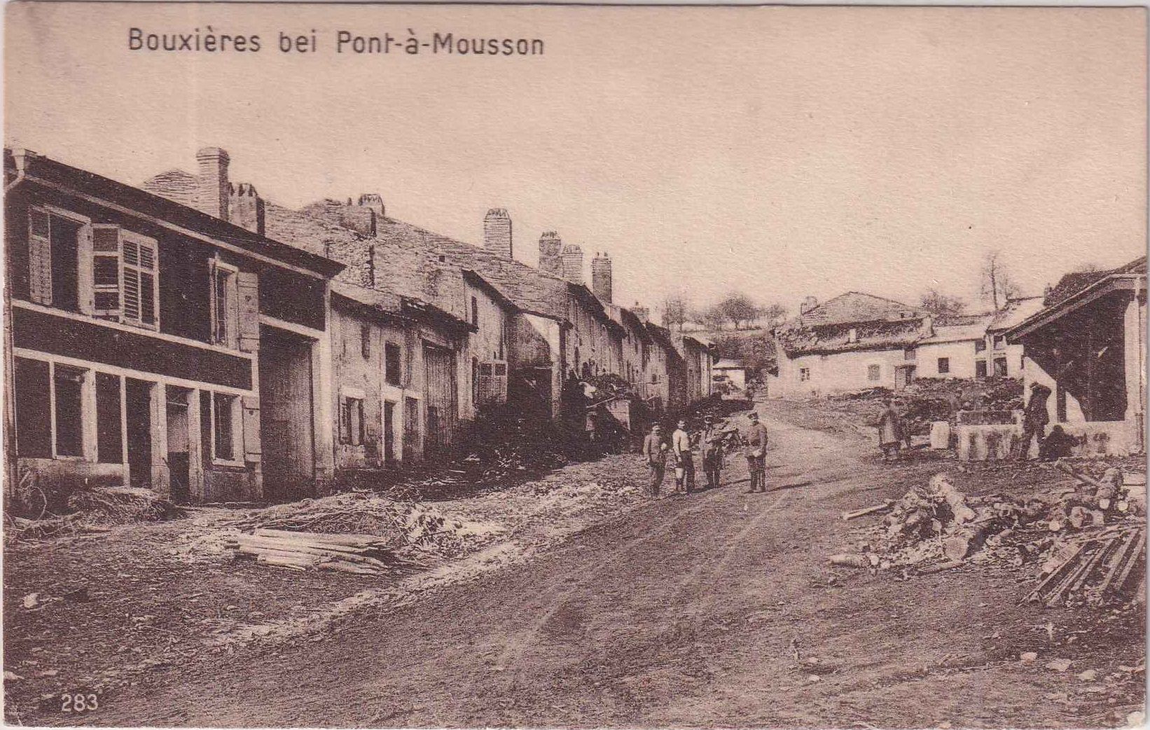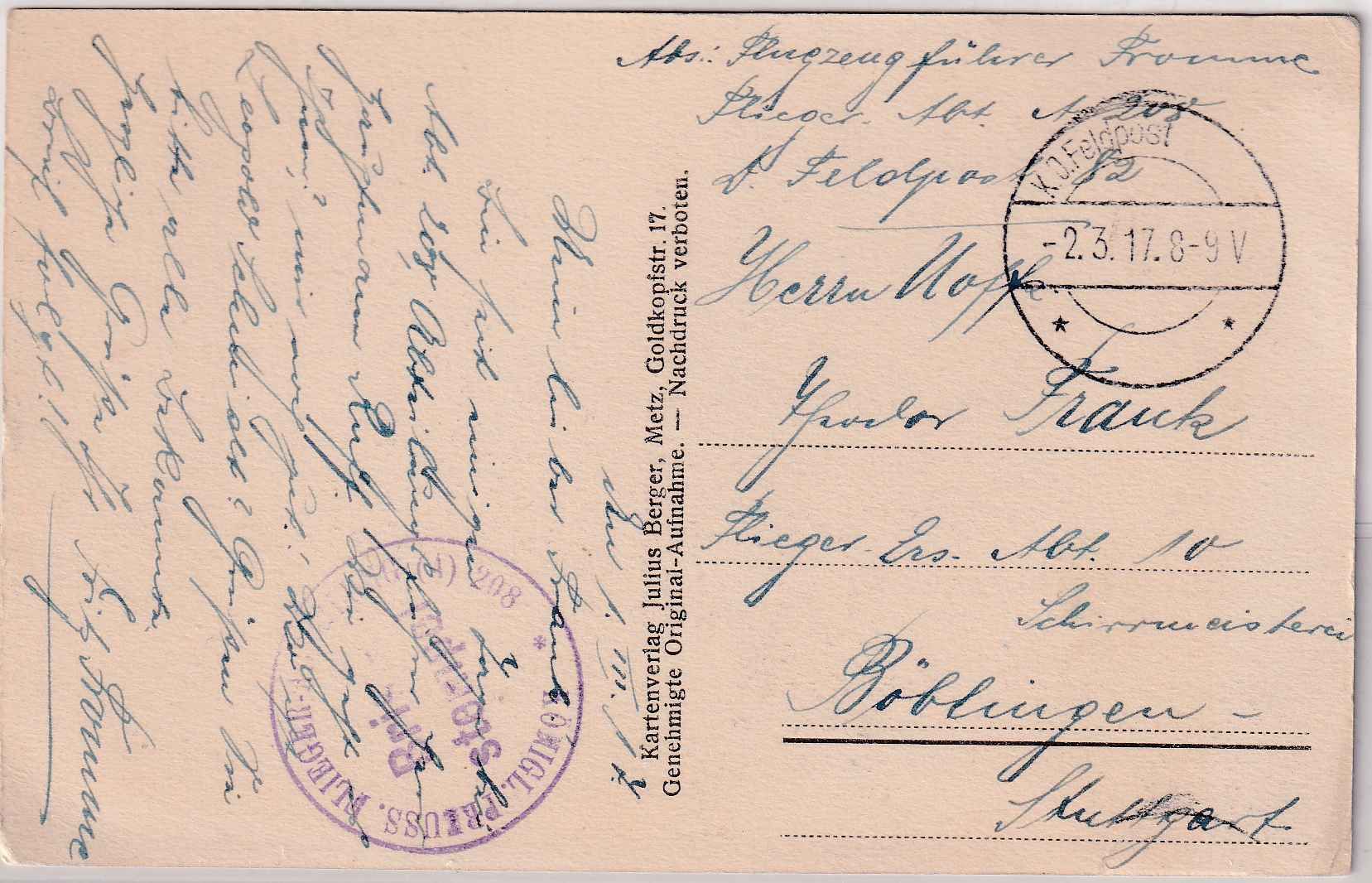 adr. an einen Uffz. in der Schirrmeisterei der Flieger-Ers.Abt. 10 - rs. sw-Straßenansicht Bouxieres bei Pont-a-Mousson - Abs. Flugzeugführer Fritz Fromme
