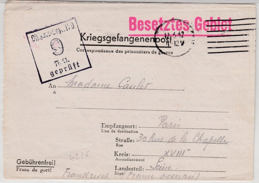 DR - Kriegsgefangenenpost Lager Torgau, Faltbrief n. Paris 1942, Lagerzensur