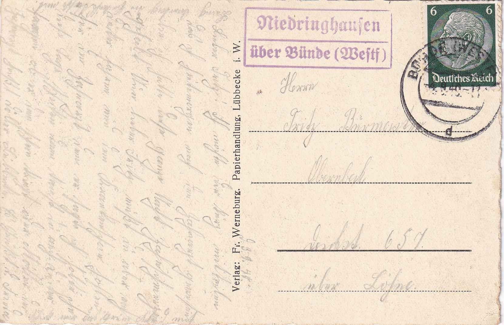 DR - Niedringhausen ü. Bünde (Westf.) Landpost-Ra2 Karte n. Löhne 1940