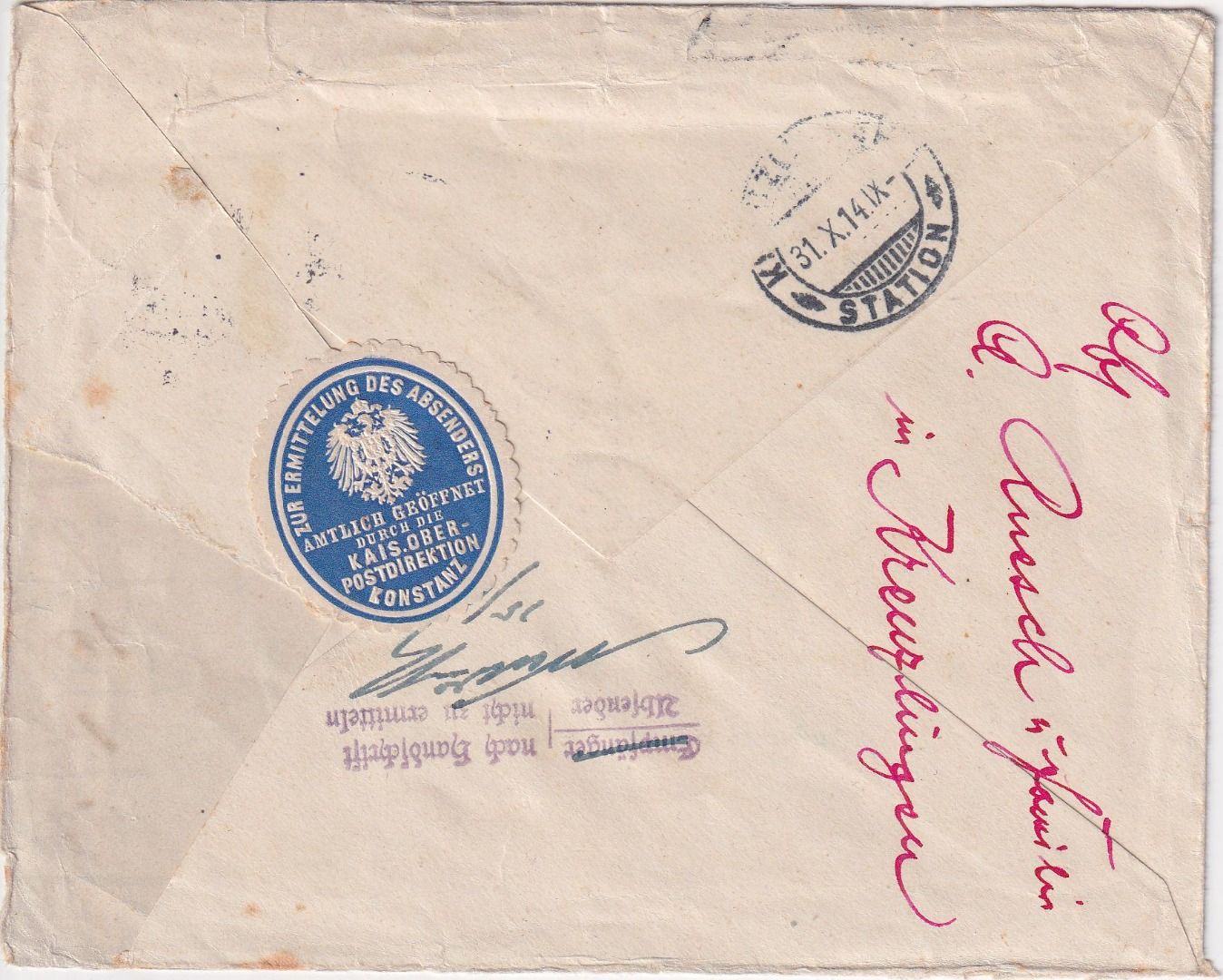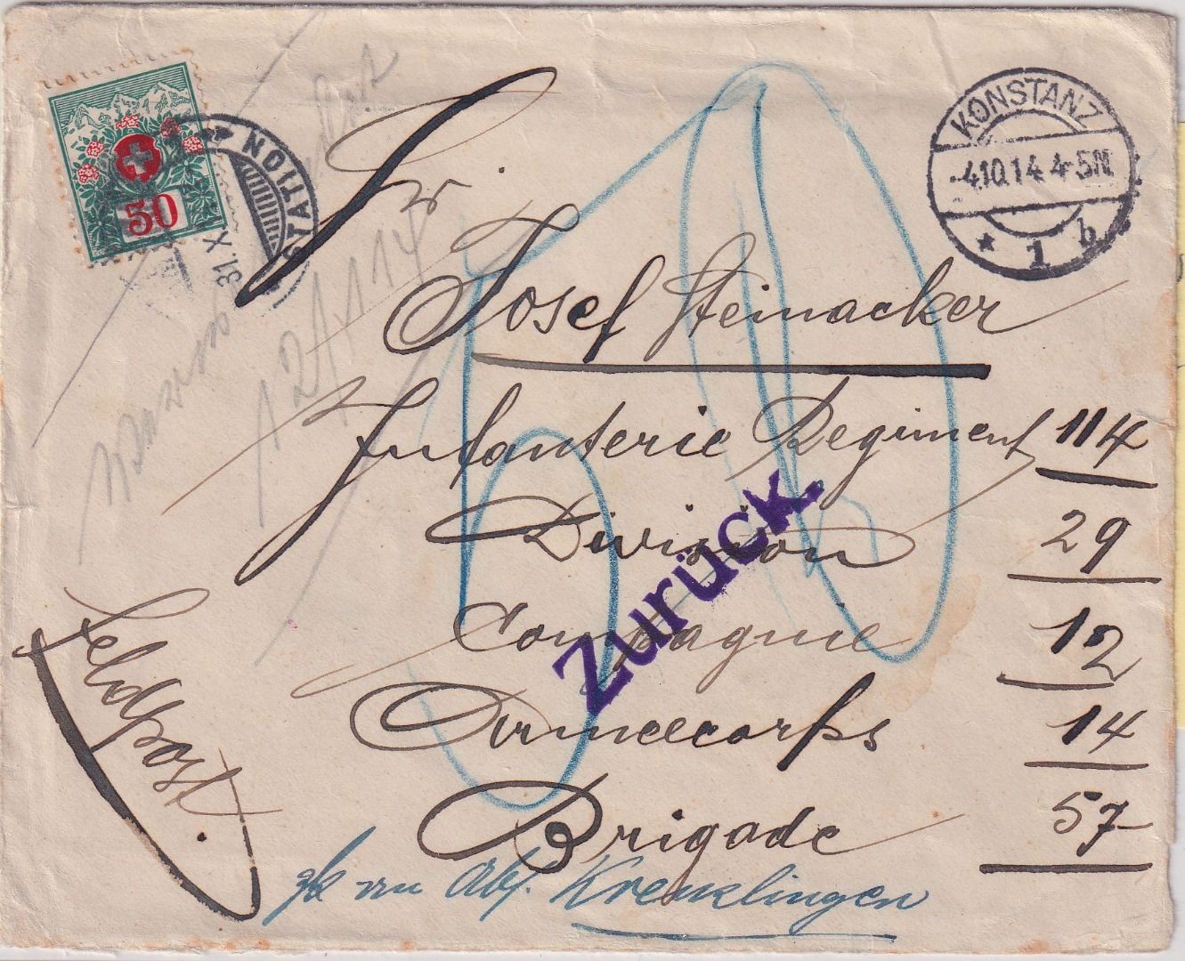 adr. an einen Soldaten beim IR 114 (nicht zustellbar/verwundet) - bei der OPD Konstanz zur Ermittlung des Absenders geöffnet und in die Schweiz (!) nach Kreuzlingen zurückgesandt - der Brief wurde offenbar zur Umgehung der deutschen Zensur nicht in Kreuzlingen sondern in Konstanz aufgegeben - Kuvert dreiseitig offen (rs. fehlt ein kleines Teil der Seitenklappe) - post- und zeitgeschichtlich hochinteressanter Beleg !