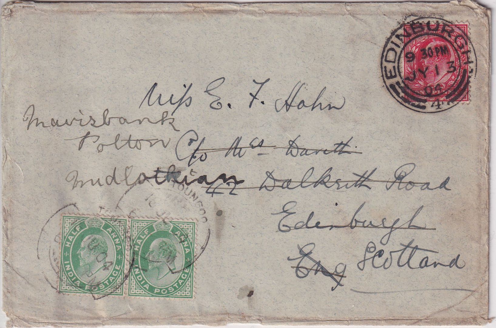 vermutlich Drucksache, ursprünglich von Toungoo nach Edinburgh/Scotland - dort mit 1 P. auffrankiert und weitergeleitet nach Polton - rs. Ank.stpl. Lasswade - Umschlag Mgl., dennoch interessanter Weiterleitungsbeleg