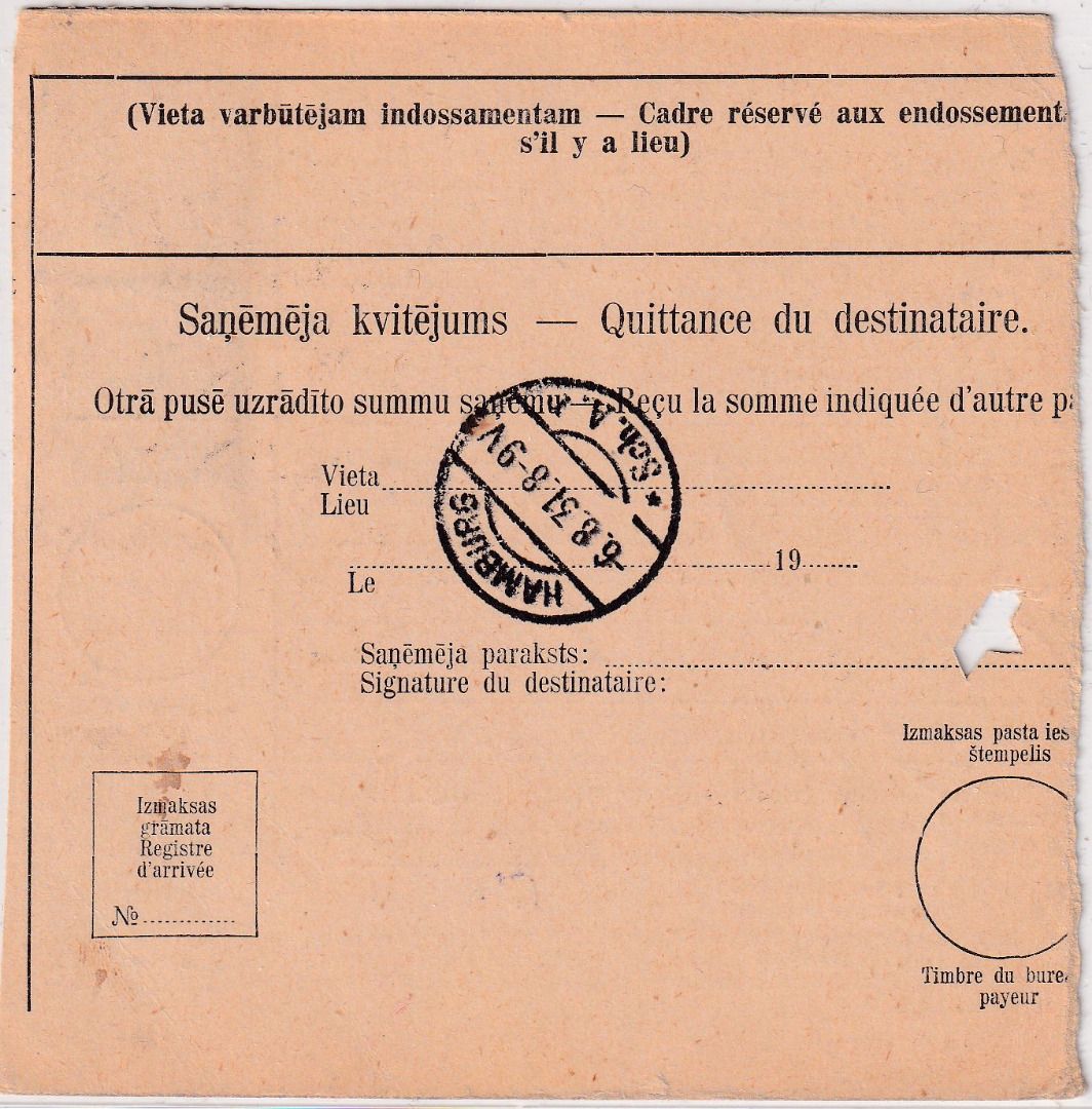 Lettland - 40+5 S. Wappen Auslandspostanweisung Riga - Hamburg 1931