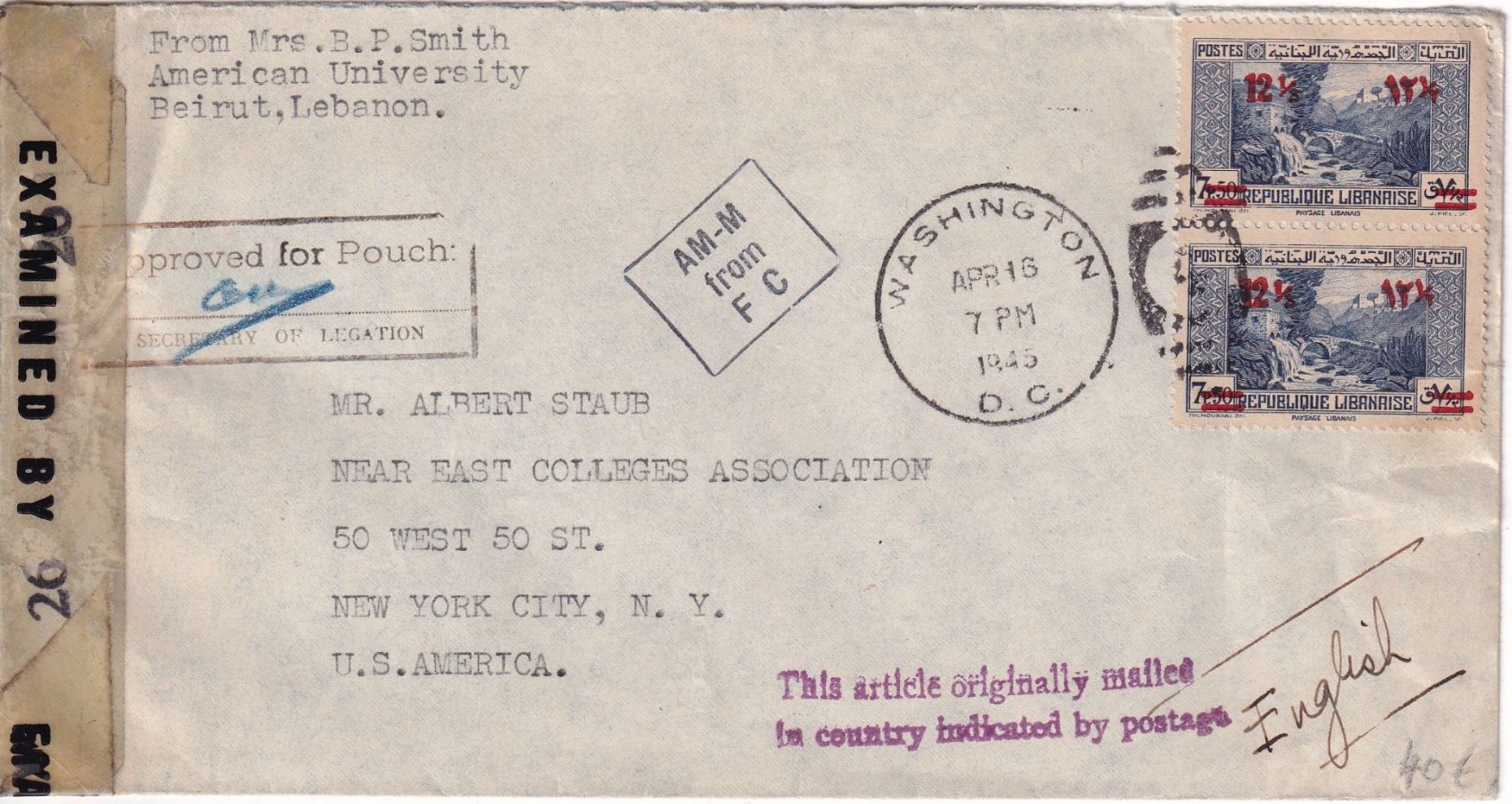 Ra2 "Approved for pouch: Secretary of legation" - viol. L2 "This article oroginally mailed in country indicated by postage" - ABs.: American University Beirut - ohne Inhalt