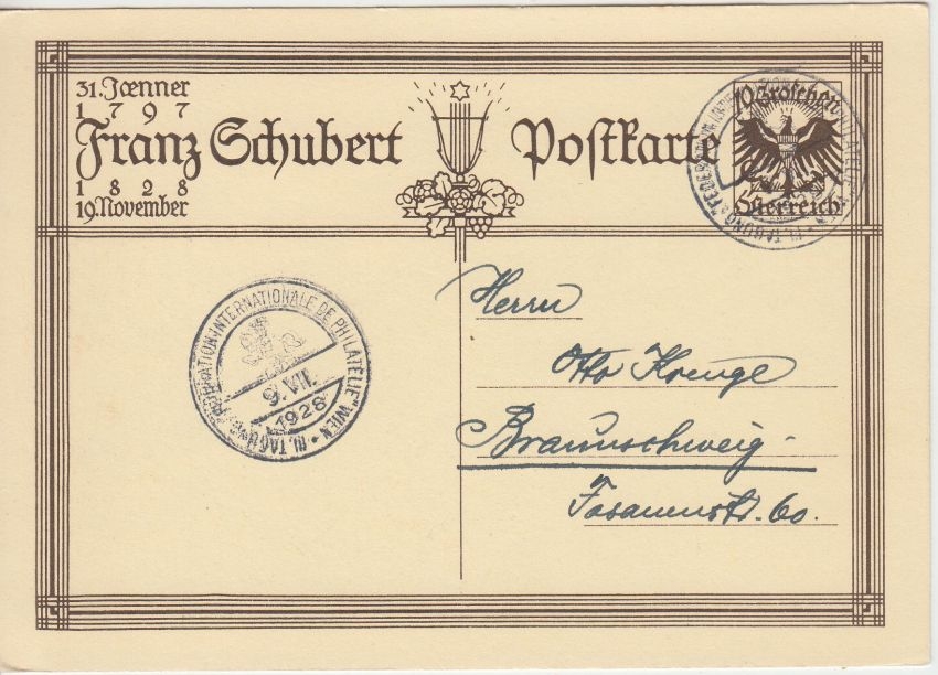 Österreich - 10 Gr. Schubert Sonder-Ganzsache SST Wien III. FIP-Tagung 1928