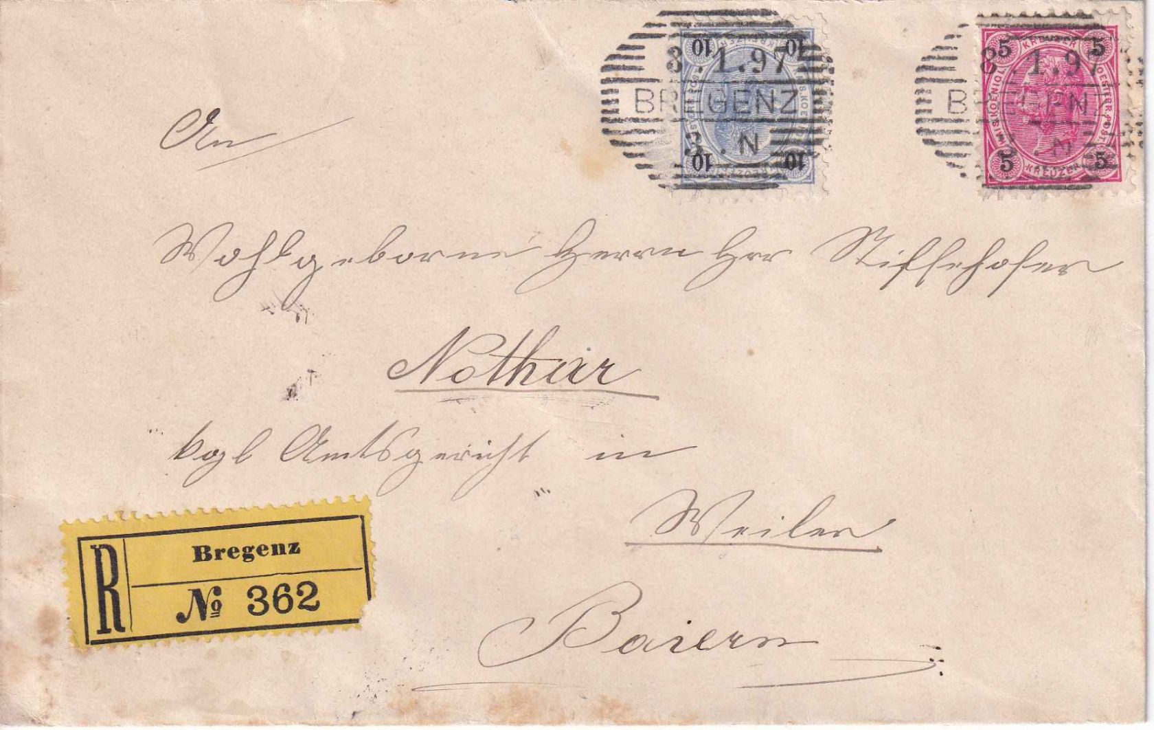 Österreich - 10+5 Kr. Franz-J. Einschreibebrief Bregenz - Weiler 1897