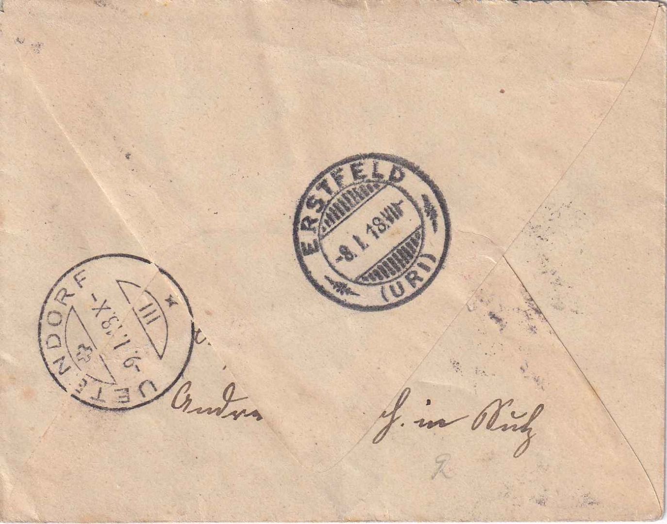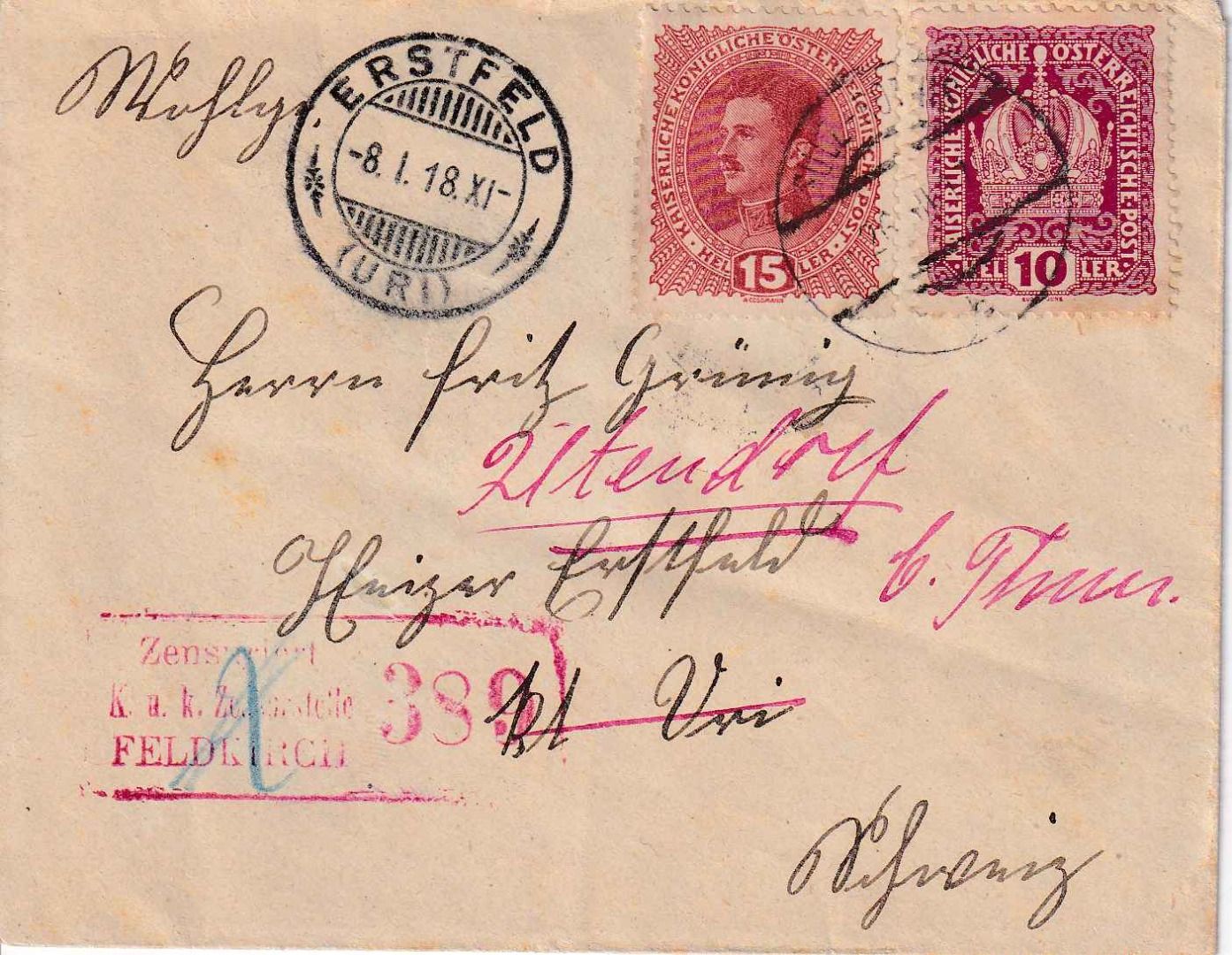 gelaufen n. Erstfeld - Weiterleitung n. Uetendorf - Zensur Feldkirch - ohne Inhalt