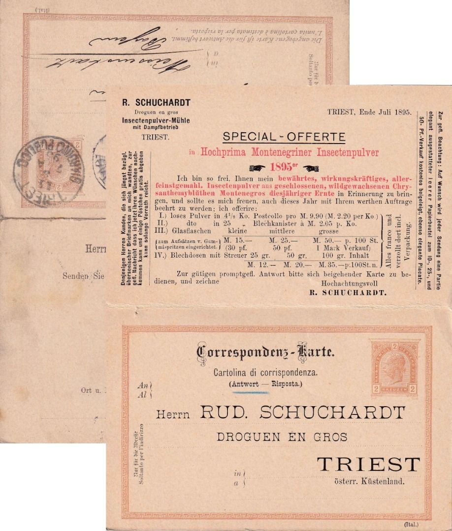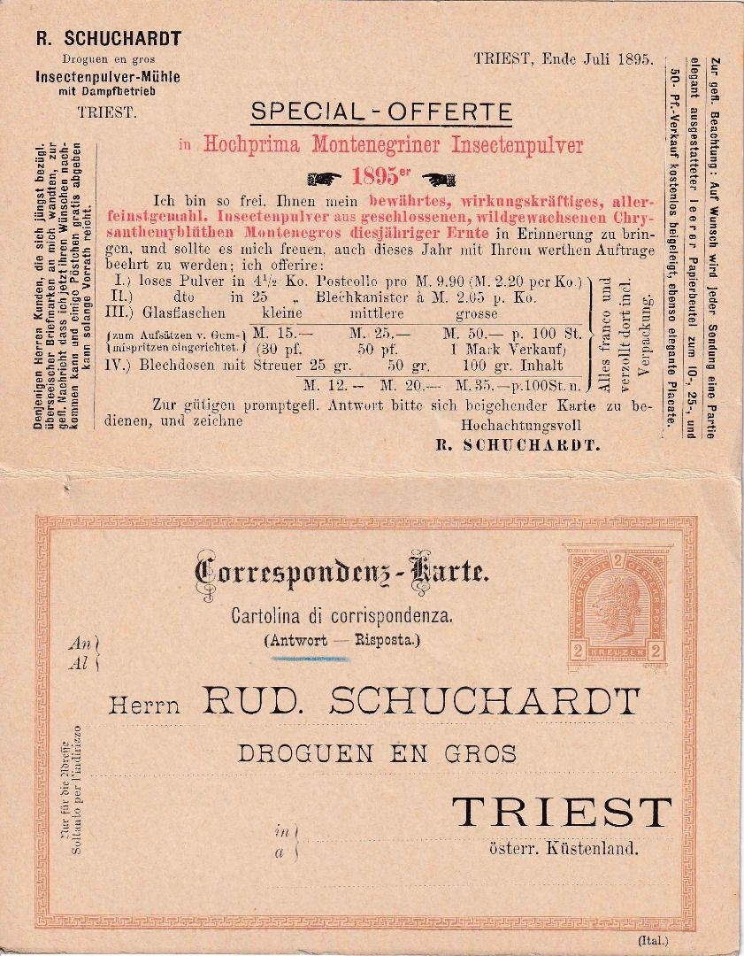 Zudruck d. Fa. Schuchardt "Droguen en Gros", u.a. "Hochprima Montenegriner Insectenpulver"