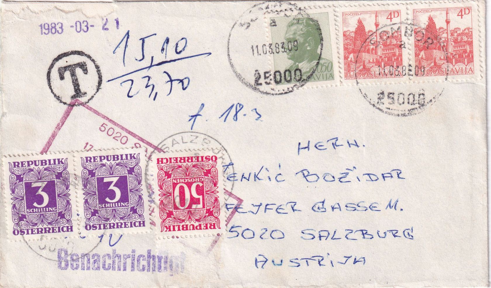 Nachgebührstempel mit Portomarken überklebt - Kuvert links oben kleiner Ausriss (sauber korrigiert) - ohne Inhalt