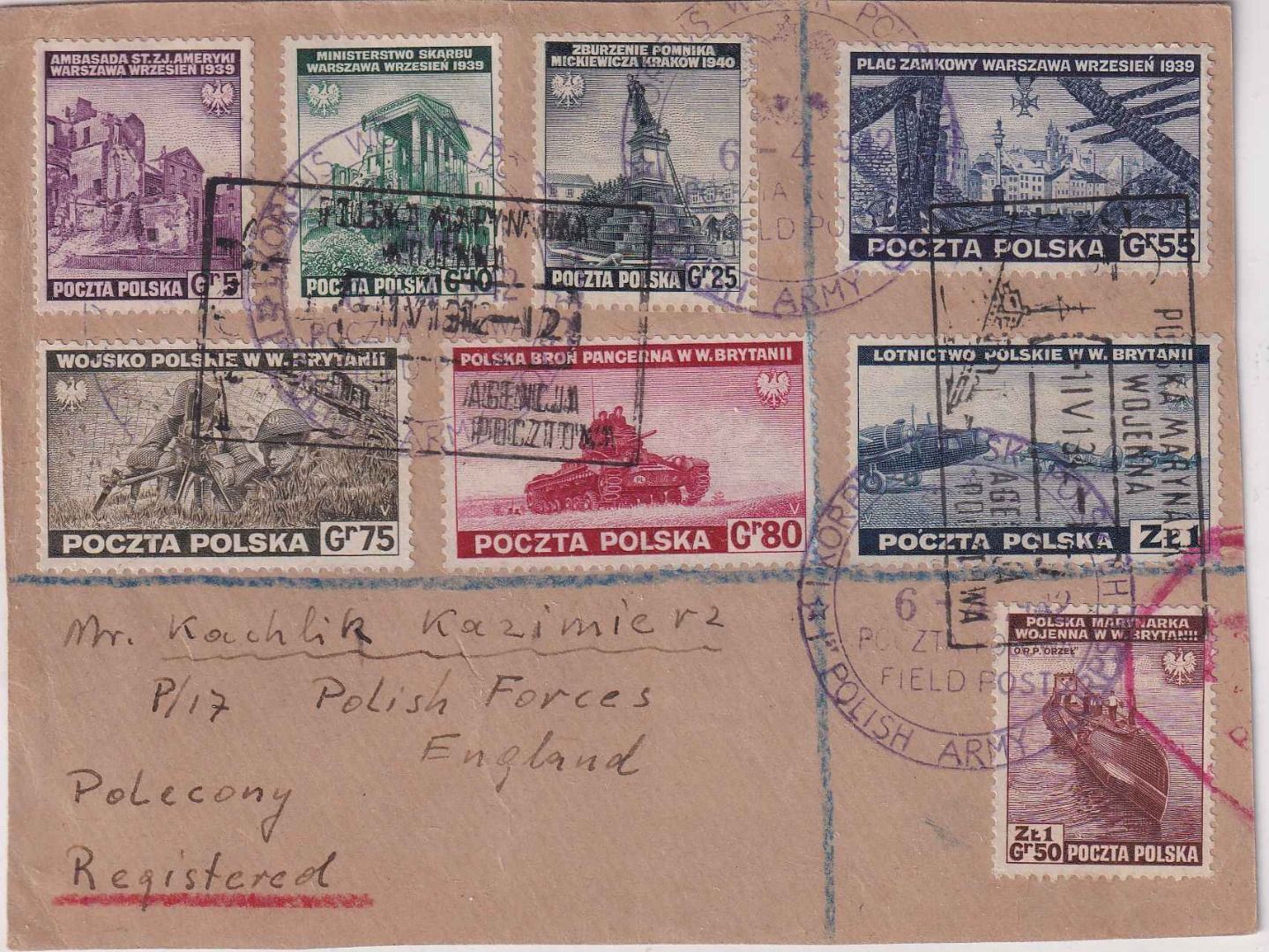 Marken mit SST d. poln. Exil-Marine u. Feldpoststpl. entwertet - Teilabschlag brit. Zensurstempel