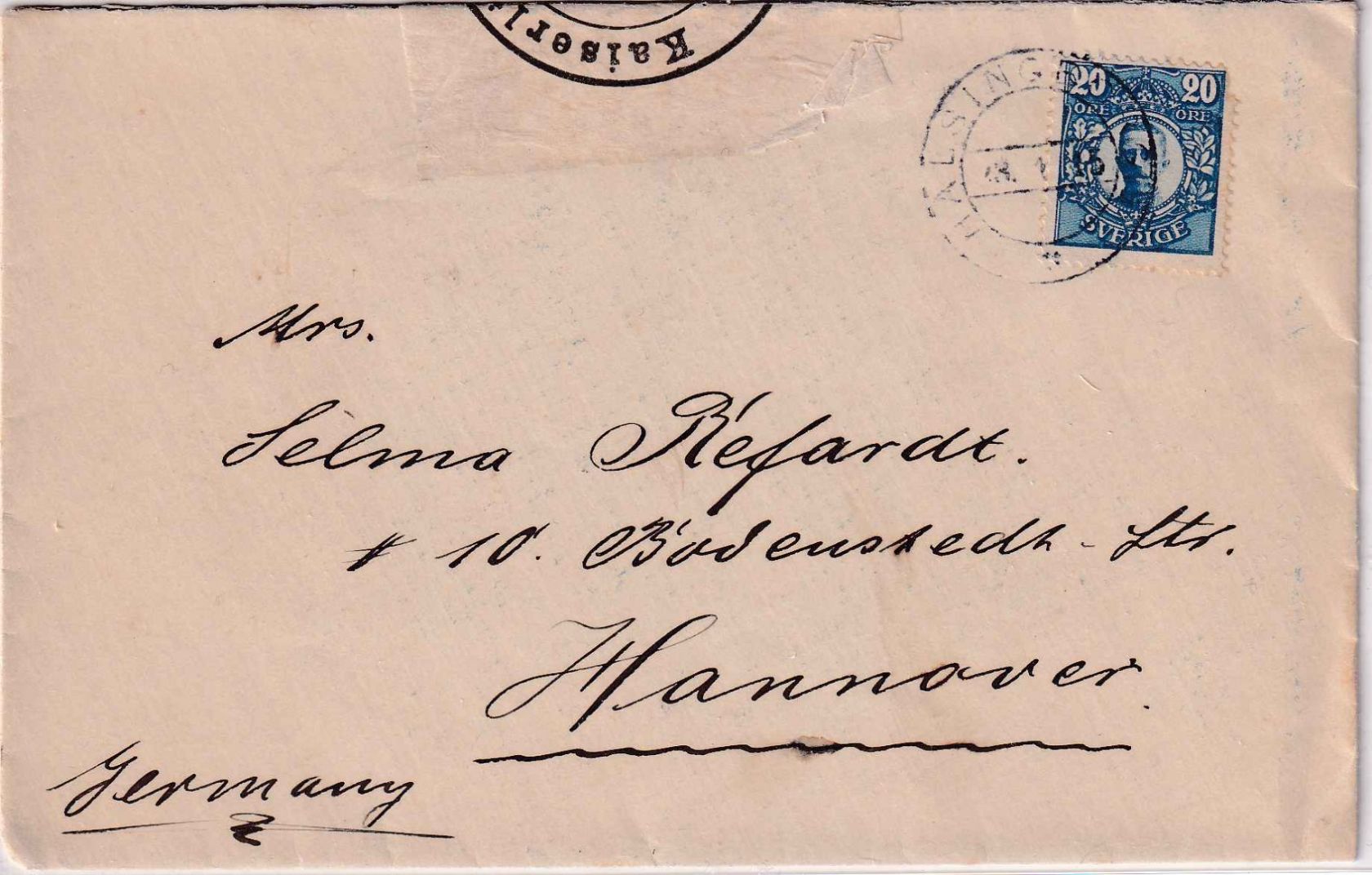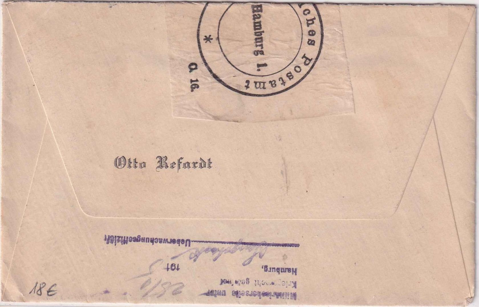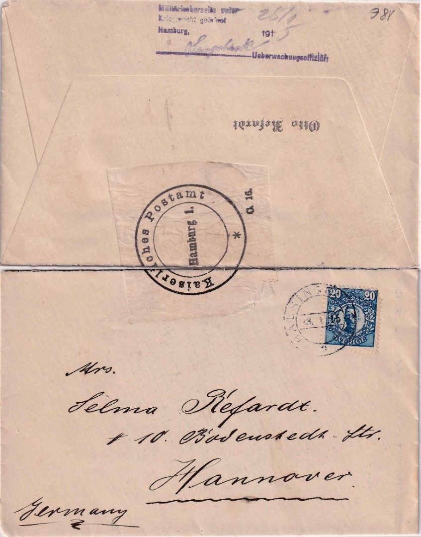 gelaufen n. Hannover - Verschlussvignette des PA Hamburg u. L4 "Militärischerseits unter Kriegsrecht..." - ohne Inhalt
