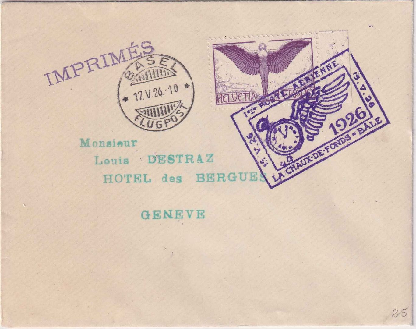 Schweiz - 1 Fr Luftpostausgabe Erstflugbrief La Chaux de Fonds - Basel 17.5.26