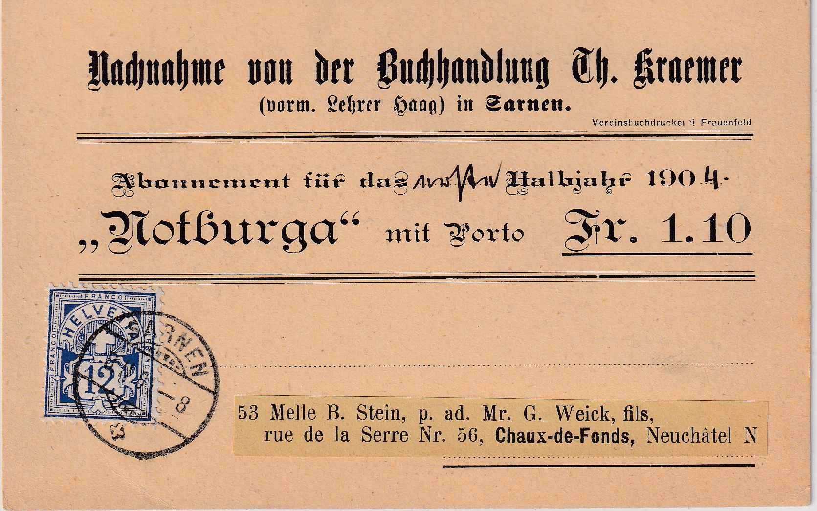 Vordruck d. Buchhandlung Th. Kraemer Abonnement "Notburga"