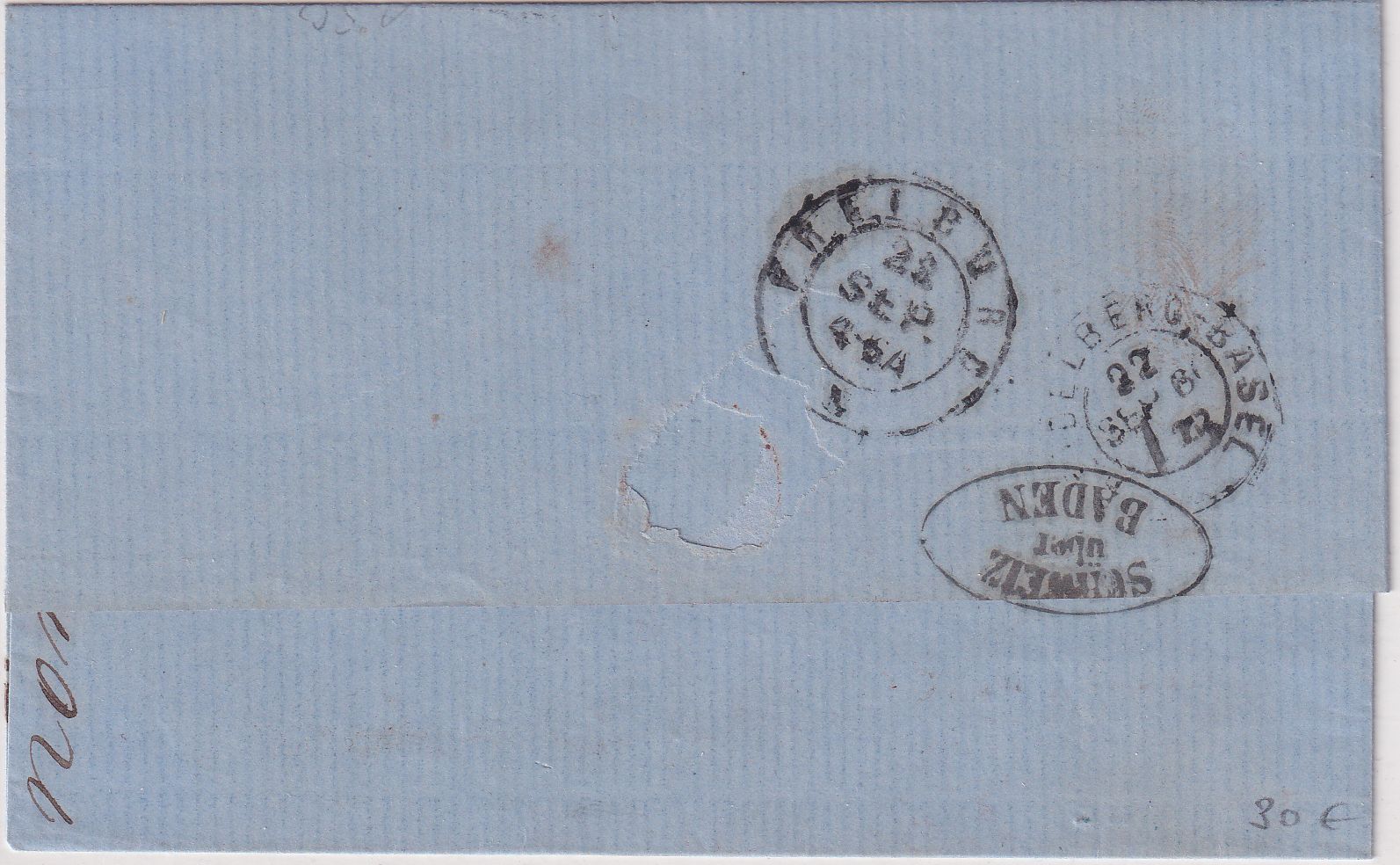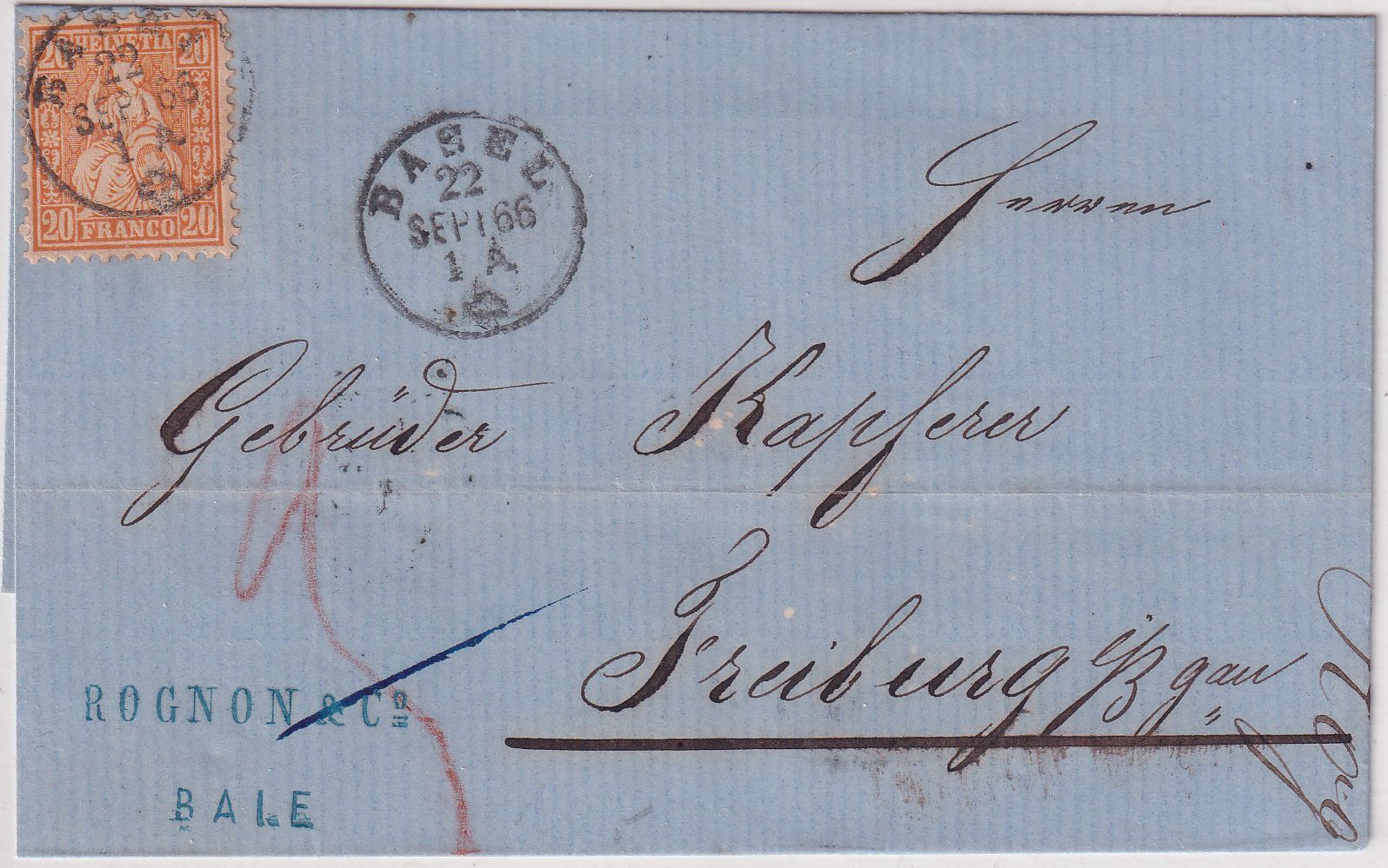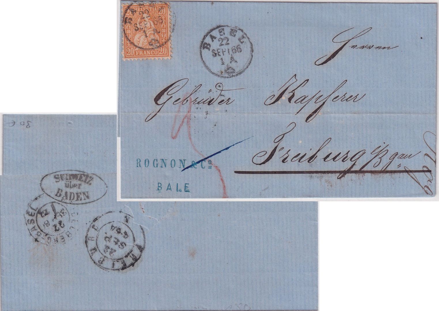 rs. Ovalstempel "Schweiz über Baden" und Bahnpost-K2 Heidelberg-Basel - ohne Inhalt