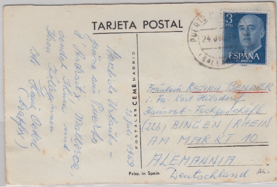 Spanien - Textilkarte Tracht, gelaufen v. mallorca 1959