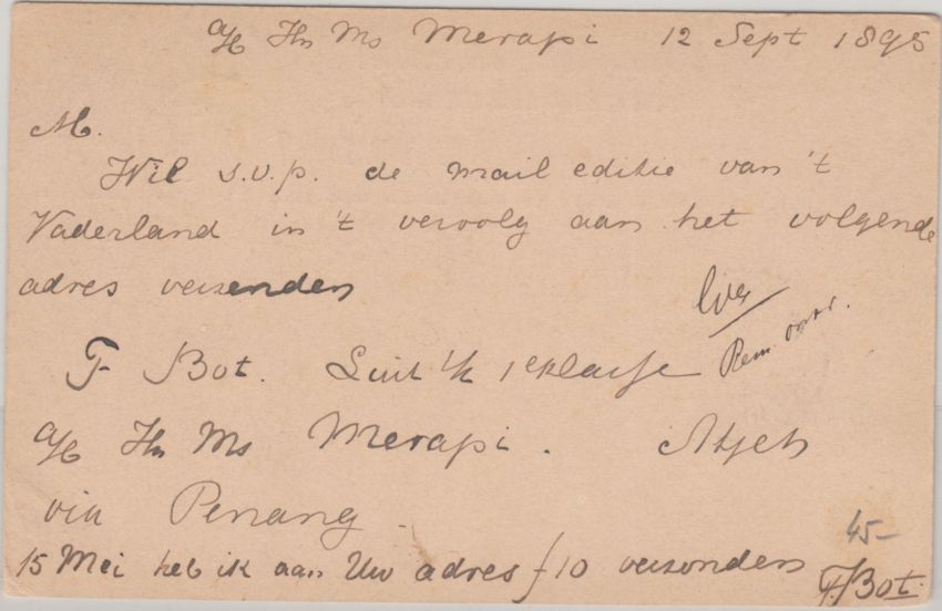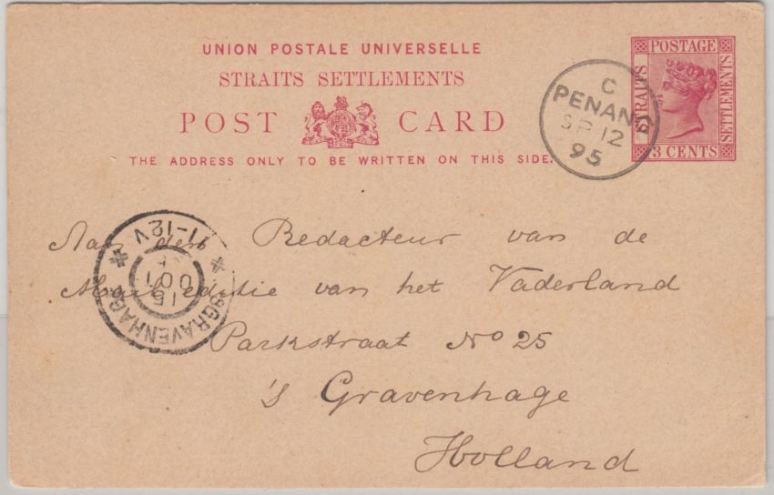 Straits Settlements - 3 C. Victoria Ganzsache n. HOLLAND Penang - Den Haag 1895