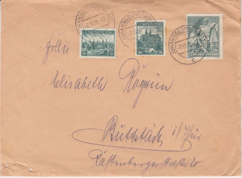 Sudetenland - Johanngeorgenstadt 7.10.38 tschech. Frankatur milit. Absender