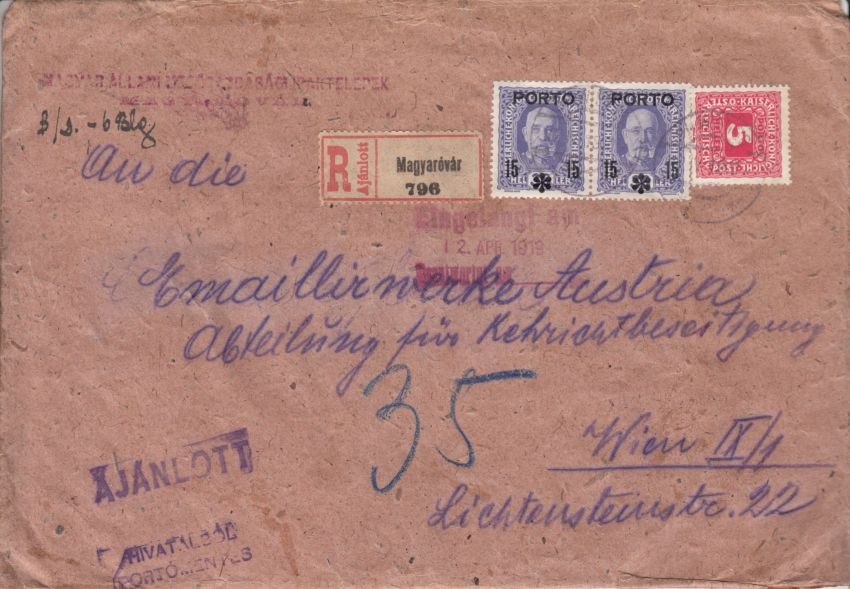 in Wien mit 35 H. nachporto belegt - ohne Inhalt
