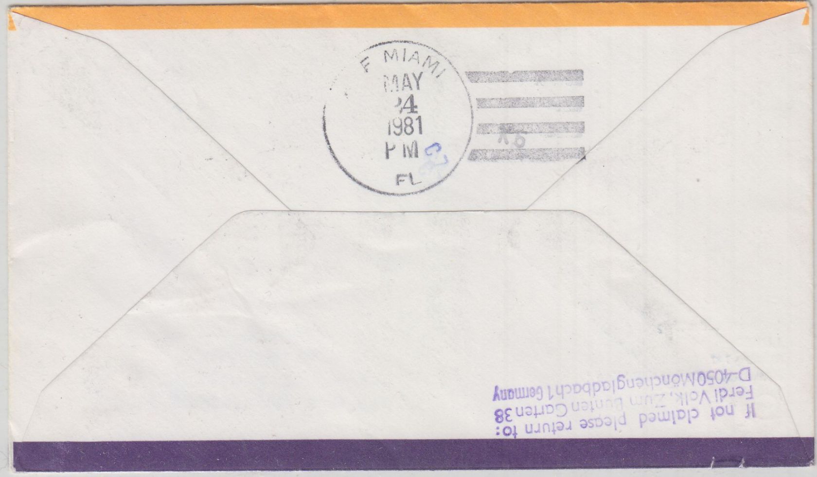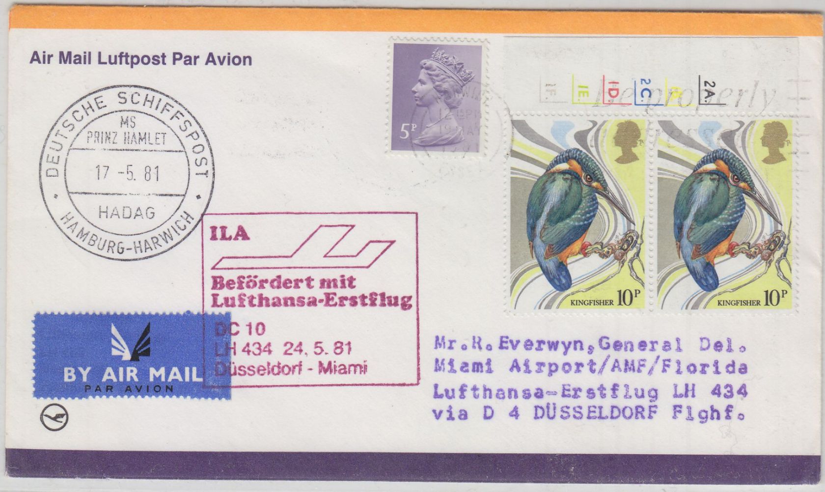 Zuleitungspost (Dt. Schiffspost MS Prinz Hamlet Hamburg - Harwich) a. Lufthansa Erstflug Düsseldof Miami - Marenpaar v. Oberrand mit Farbkodierungen - selten !