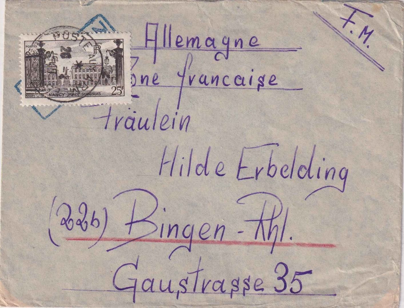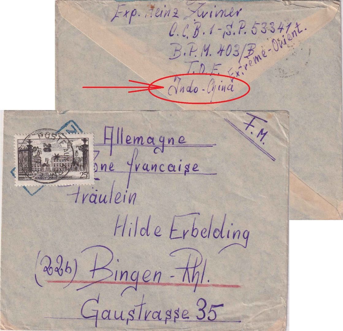 gelaufen n. Bingen (Rhein) - Absender ist mutmaßlich ein Deutscher bei der franz. Fremdenlegion - ohne Inhalt