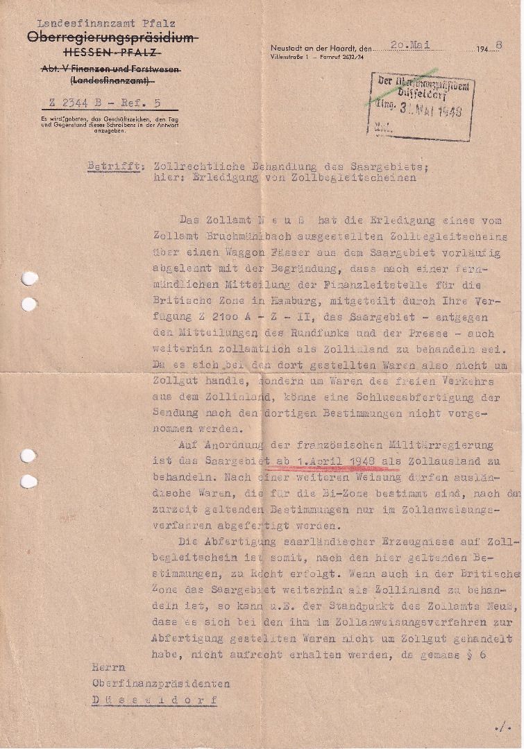 zweiseitiges Schreiben des Landesfinanzamt Pfalz hinsichtlich der zollrechtlichen Behandlung des Saargebietes - übliche Aktenlochung