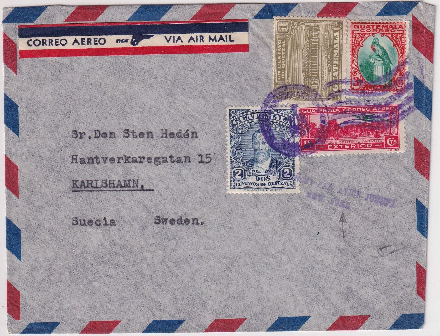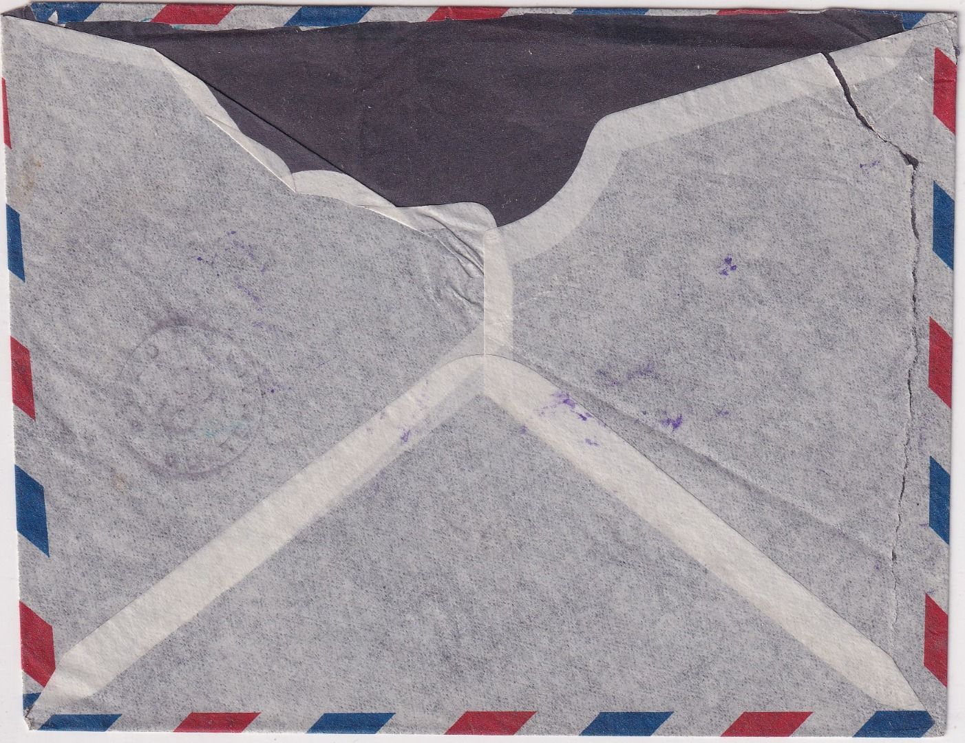 viol. L2 "Affranchi par avion jusqua New York" (Luftpostgebühr bis NY bezahlt) - Kuvert zweiseitig offen, obere Briefklappe fehlt - ohne Inhalt