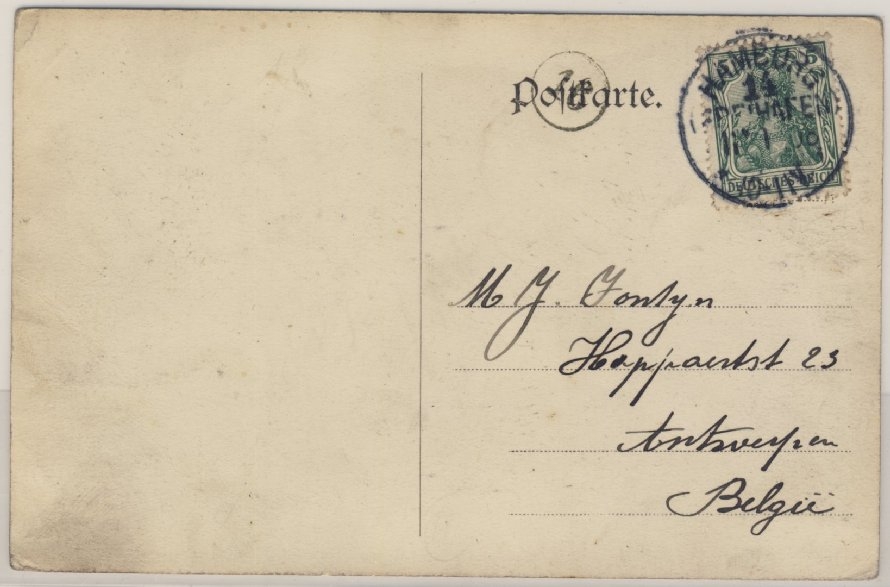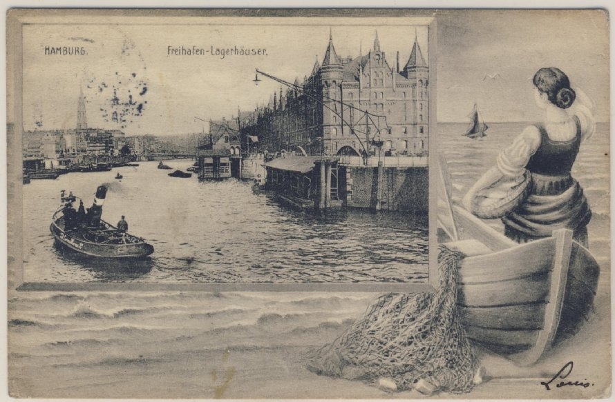 Hamburg - Freihafen-Lagerhäuser, sw-Ansichtskarte, gelaufen n. Belgien 1908