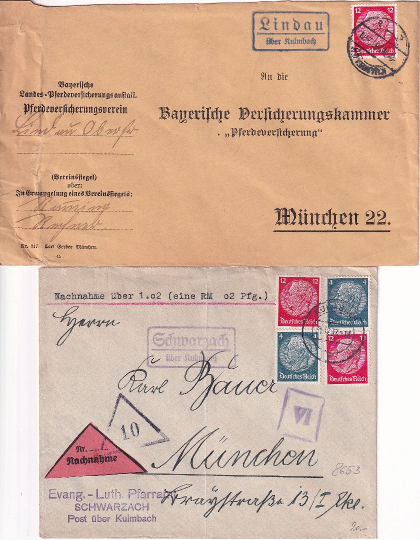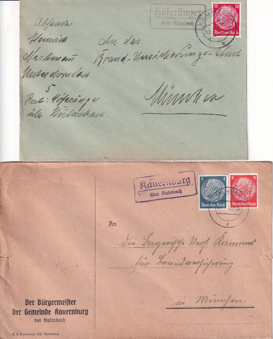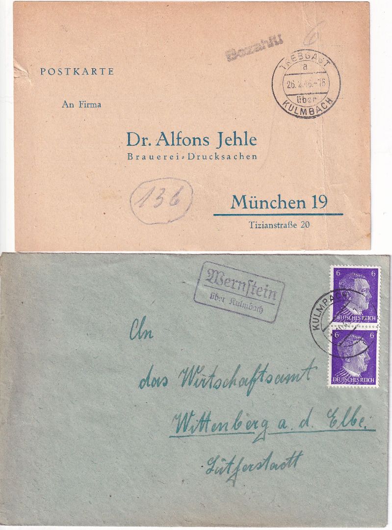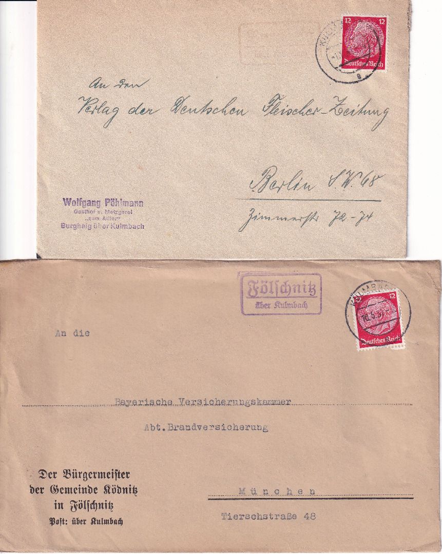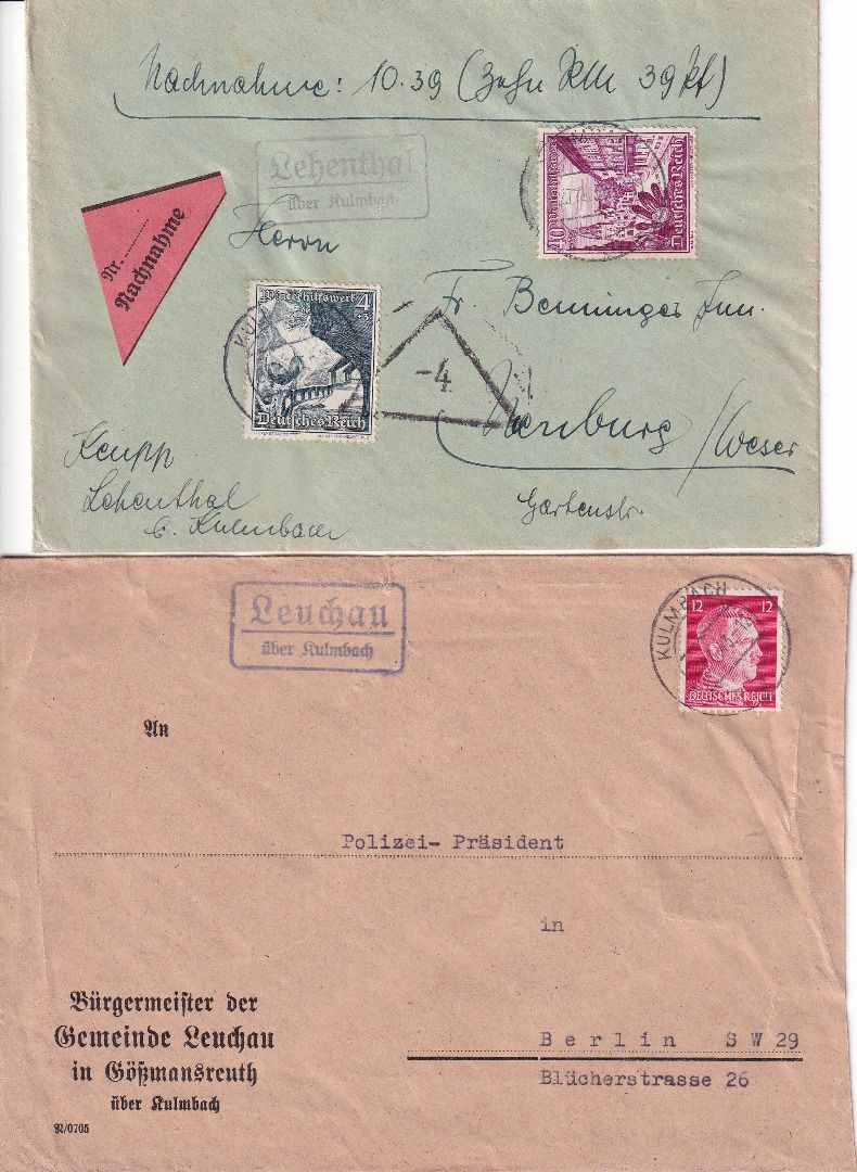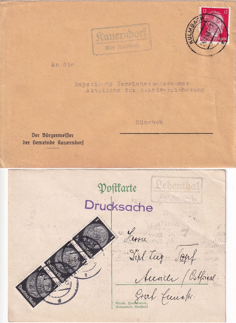 Sammlung von 12 verschiedenen Landpoststellen-Stempeln (evtl. inkl.Untertypen) auf Briefen und Postkarten aus dem Zeitraum 1937 bis 1946: Burghaig, Fölschnitz, Höferänger, Kuaernburg, Kauerndorf, Lehenthal (2, 1x Nachnahmebrief), Leuchau, Lindau, Schwarzach (Nachnahmebrief), Trebgast, Wernstein - in der Reichhaltigkeit mit teils seltenen Stempeln nur schwer zusammenzutragen - Umschläge teilweise mit Bedarfsspuren - möglicherweise werde nicht alle Bilder angezeigt/bitte ggf. Kontakt aufnehmen - BITTE keine Anfragen wegen Einzelentnahmen