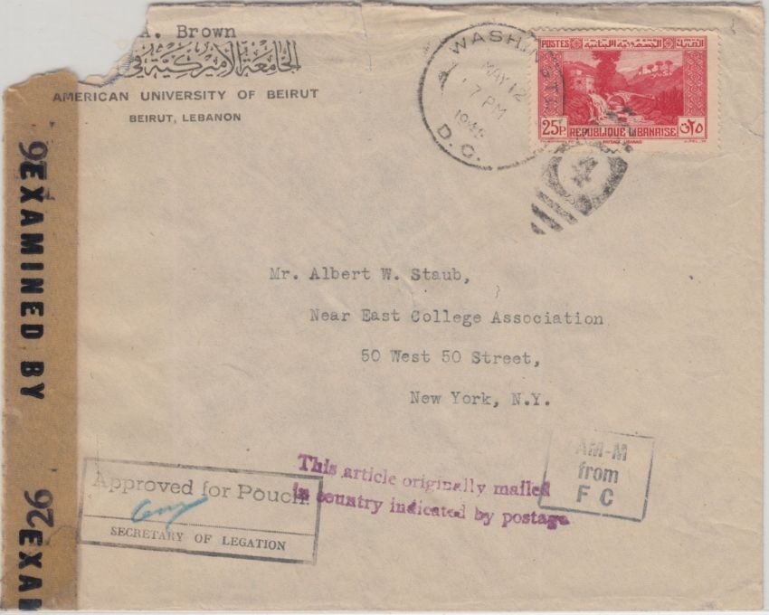 Libanon-Frankatur erst in Washington entwertet - Kuvert links oben kleine Fehlstelle - ohne Inhalt